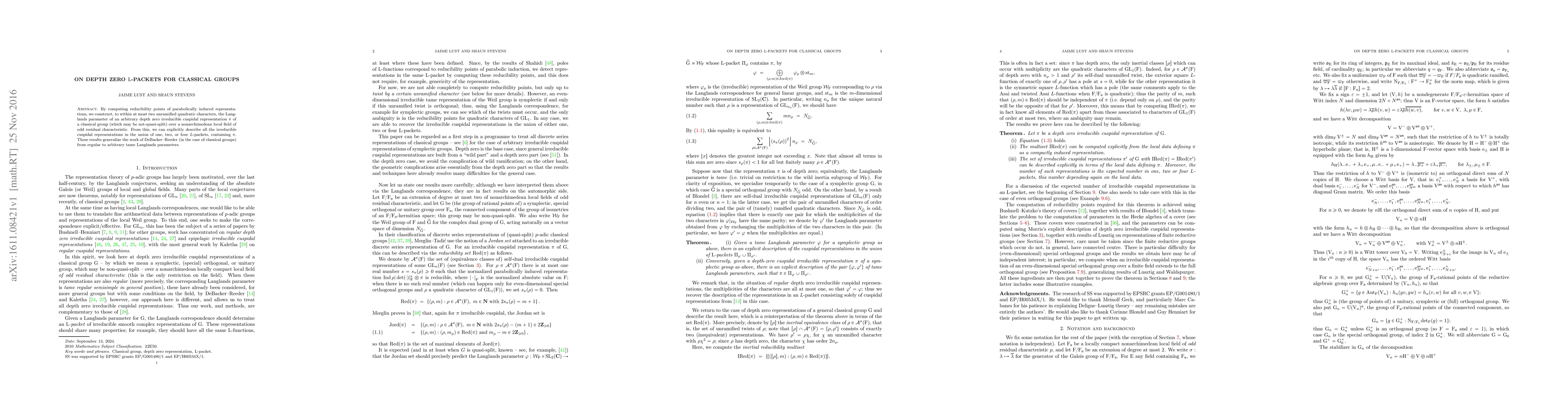 By computing reducibility points of parabolically induced representations, we construct, to within at most two unramified quadratic characters, the Langlands parameter of an arbitrary depth zero irreducible cuspidal representation $\pi$ of a classical group (which may be not-quasi-split) over a nonarchimedean local field of odd residual characteristic. From this, we can explicitly describe all the irreducible cuspidal representations in the union of one, two, or four L-packets, containing $\pi$. These results generalize the work of DeBacker-Reeder (in the case of classical groups) from regular to arbitrary tame Langlands parameters.