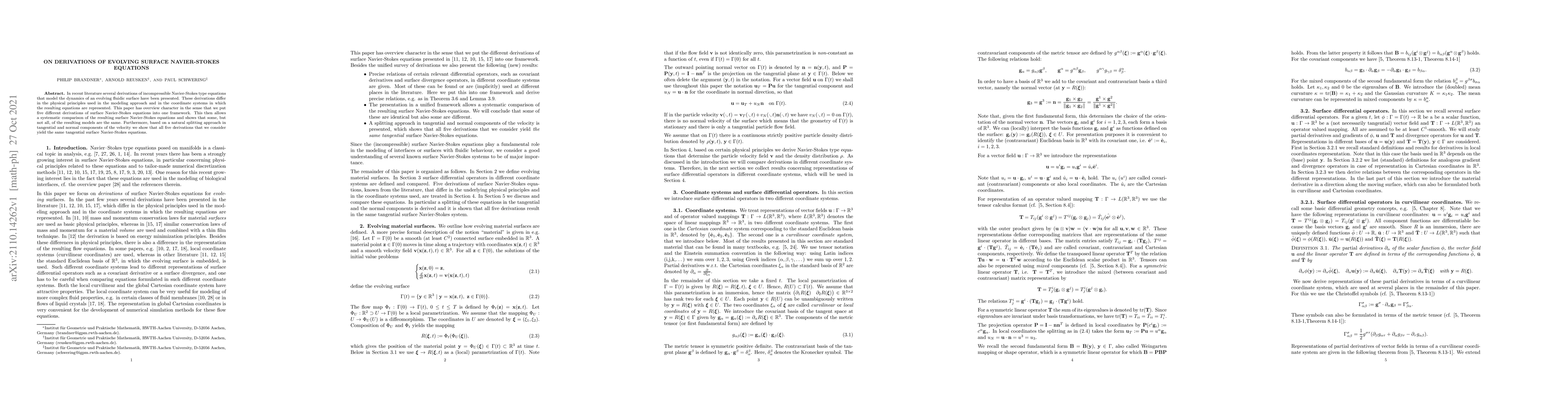 In recent literature several derivations of incompressible Navier-Stokes type equations that model the dynamics of an evolving fluidic surface have been presented. These derivations differ in the physical principles used in the modeling approach and in the coordinate systems in which the resulting equations are represented. This paper has overview character in the sense that we put five different derivations of surface Navier-Stokes equations into one framework. This then allows a systematic comparison of the resulting surface Navier-Stokes equations and shows that some, but not all, of the resulting models are the same. Furthermore, based on a natural splitting approach in tangential and normal components of the velocity we show that all five derivations that we consider yield the same tangential surface Navier-Stokes equations.