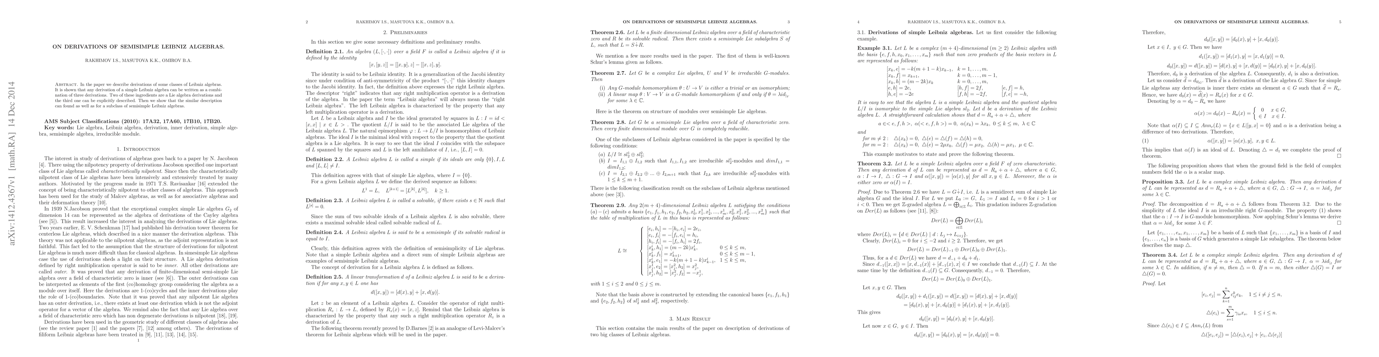 Summary: The paper investigates derivations in simple and semisimple Leibniz algebras, proving that any derivation in a simple Leibniz algebra can be expressed as a combination of a Lie algebra derivation and two other specific derivations, with similar findings extending to a subclass of semisimple Leibniz algebras.