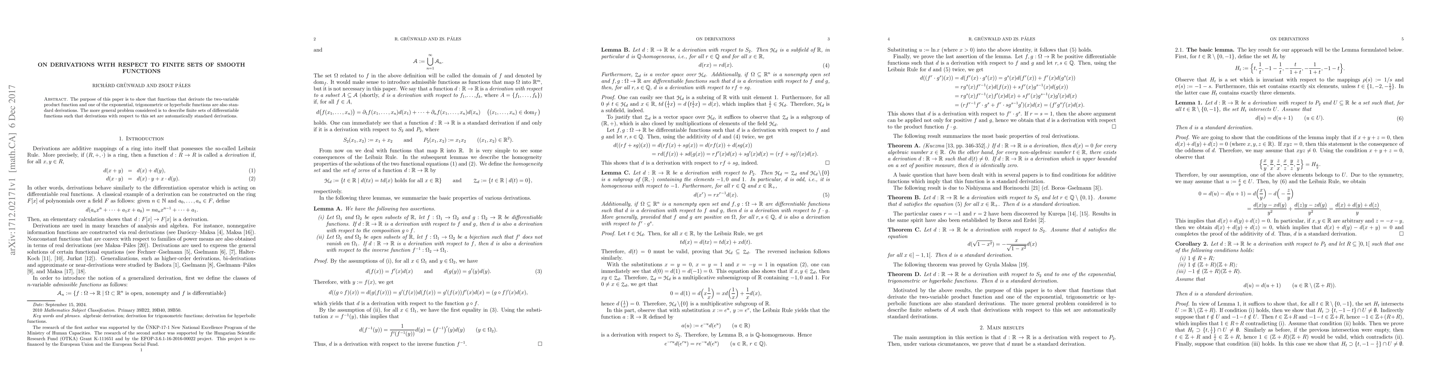 The purpose of this paper is to show that functions that derivate the two-variable product function and one of the exponential, trigonometric or hyperbolic functions are also standard derivations. The more general problem considered is to describe finite sets of differentiable functions such that derivations with respect to this set are automatically standard derivations.