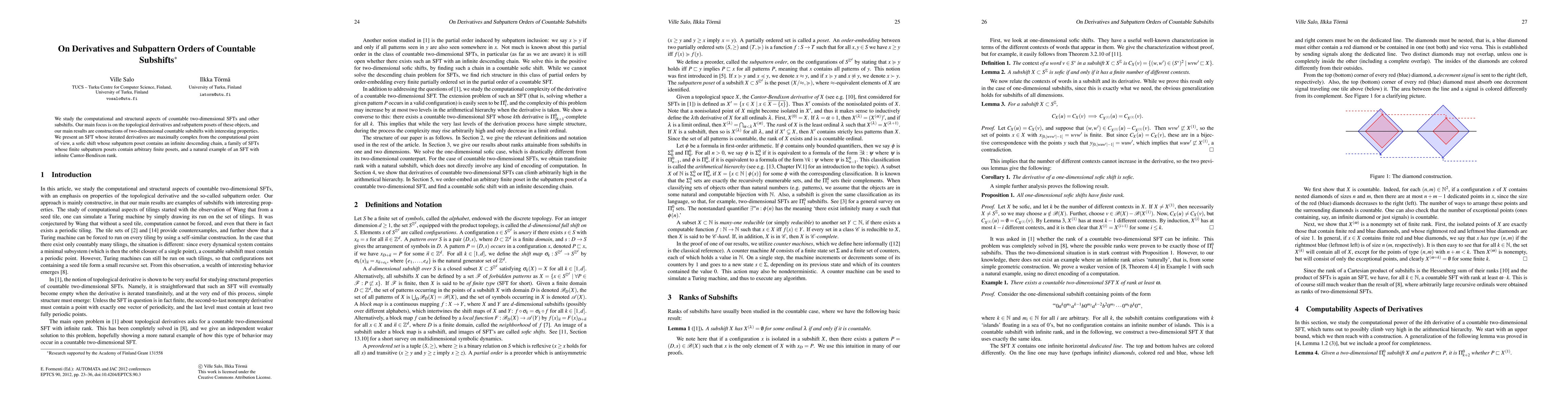 This paper investigates the computational and structural properties of countable two-dimensional synchronous finite-state transductors (SFTs) and other subshifts, focusing on their topological derivatives and subpattern posets. The key findings include the construction of SFTs with maximally complex iterated derivatives, sofic shifts with infinite descending chains in their subpattern posets, and families of SFTs embedding arbitrary finite posets in their finite subpattern posets.