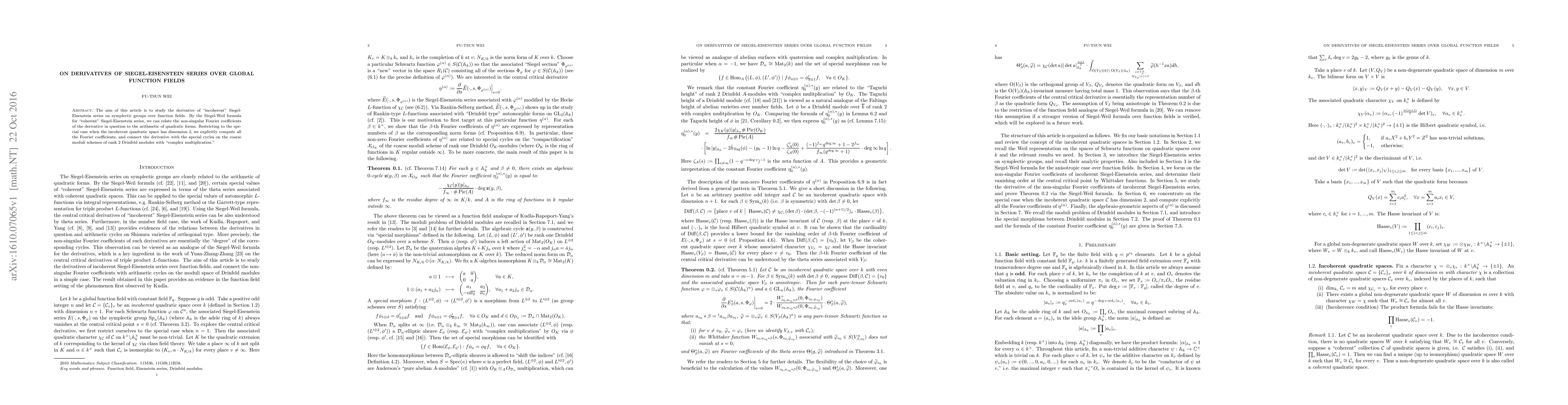 The paper presents explicit computations and connections for Fourier coefficients of incoherent Siegel-Eisenstein series derivatives, advancing the Siegel-Weil formula's application to global function fields.