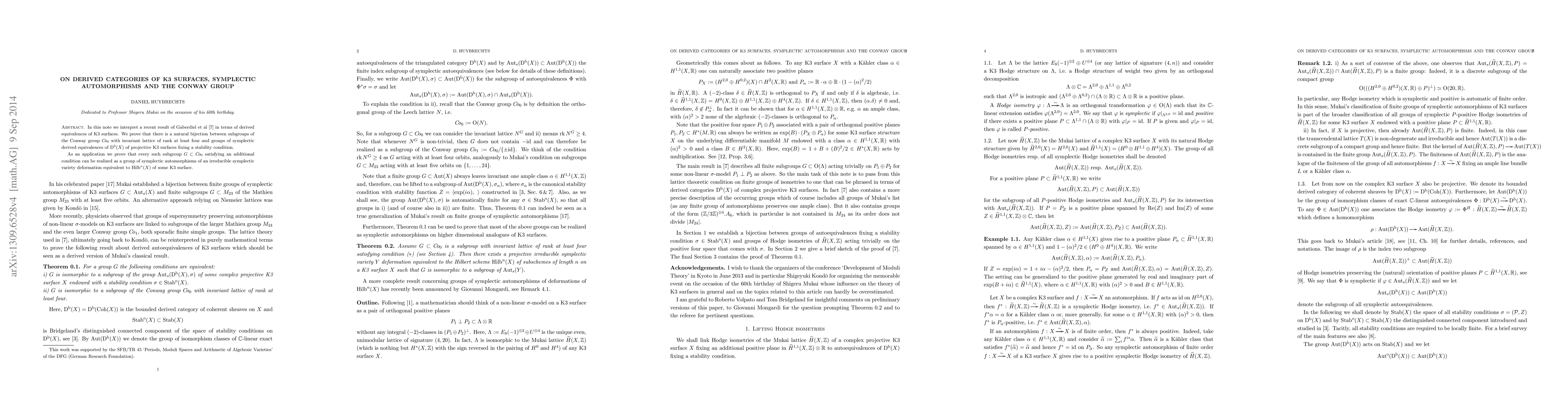 Summary: This paper establishes a natural bijection between subgroups of the Conway group with a rank-four invariant lattice and symplectic derived equivalences of K3 surfaces, interpreting a result by Gaberdiel, Hohenegger, and Volpato. It links derived categories of K3 surfaces with the Conway group's structure.