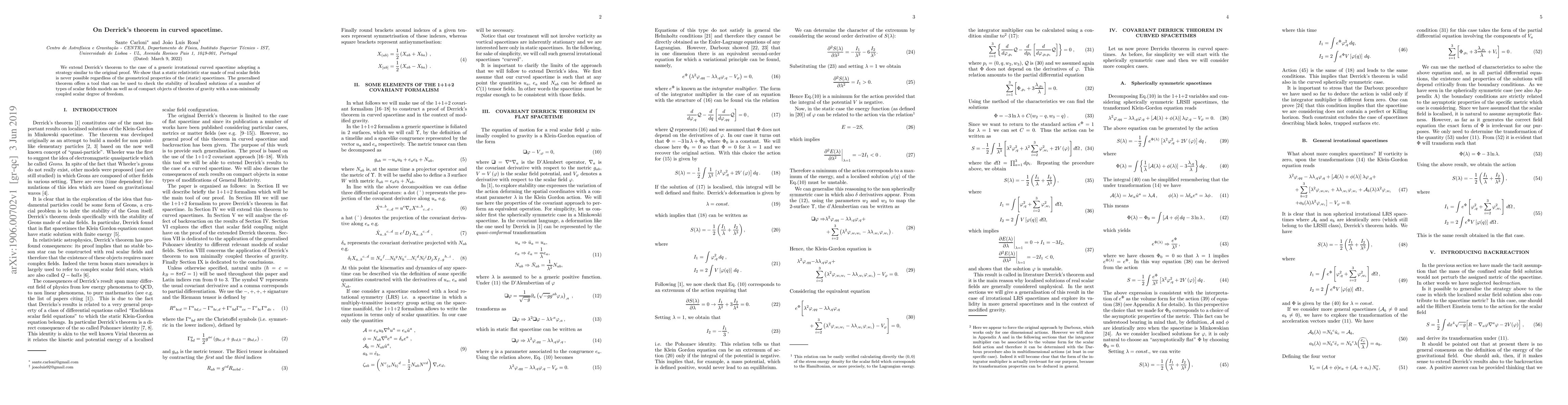 We extend Derrick's theorem to the case of a generic irrotational curved spacetime adopting a strategy similar to the original proof. We show that a static relativistic star made of real scalar fields is never possible regardless of the geometrical properties of the (static) spacetimes. The generalised theorem offers a tool that can be used to check the stability of localised solutions of a number of types of scalar fields models as well as of compact objects of theories of gravity with a non-minimally coupled scalar degree of freedom.