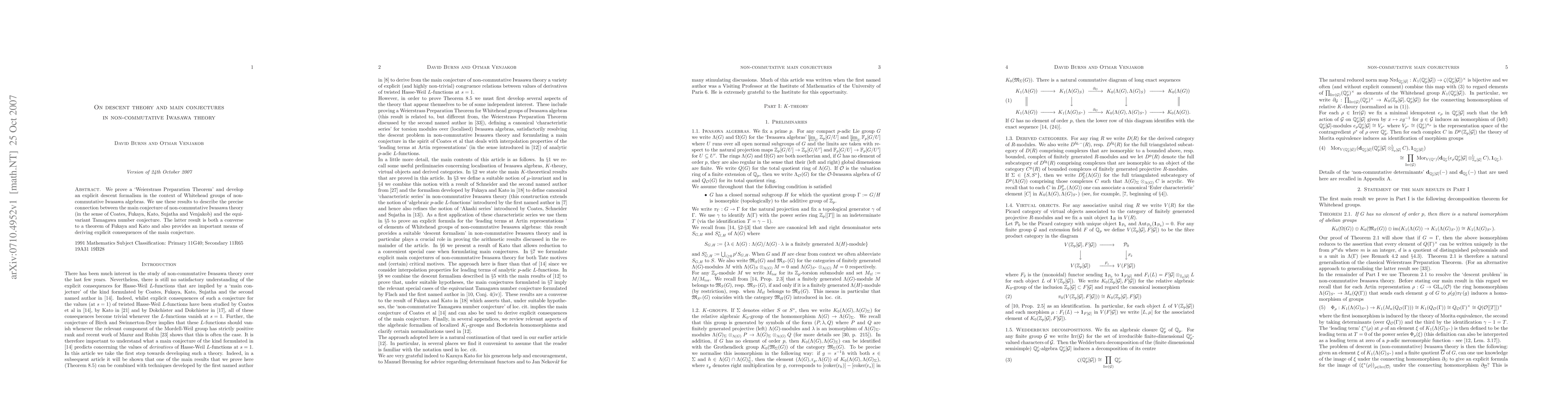 This paper establishes a Weierstrass Preparation Theorem and an explicit descent formalism for Whitehead groups in non-commutative Iwasawa algebras, linking the main conjecture of non-commutative Iwasawa theory to the equivariant Tamagawa number conjecture, thereby offering a converse to a result by Fukaya and Kato and facilitating explicit consequences of the main conjecture.