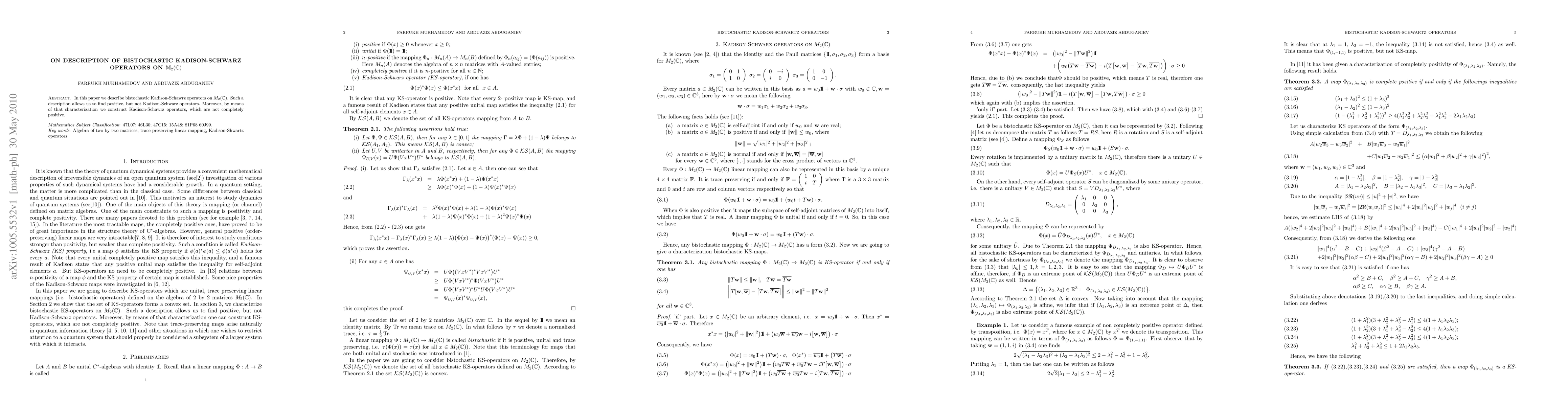 This paper characterizes bistochastic Kadison-Schwarz operators on $M_2(\mathbb{C})$ and identifies positive operators that do not satisfy the Kadison-Schwarz property. It also constructs Kadison-Schwarz operators that are not completely positive.