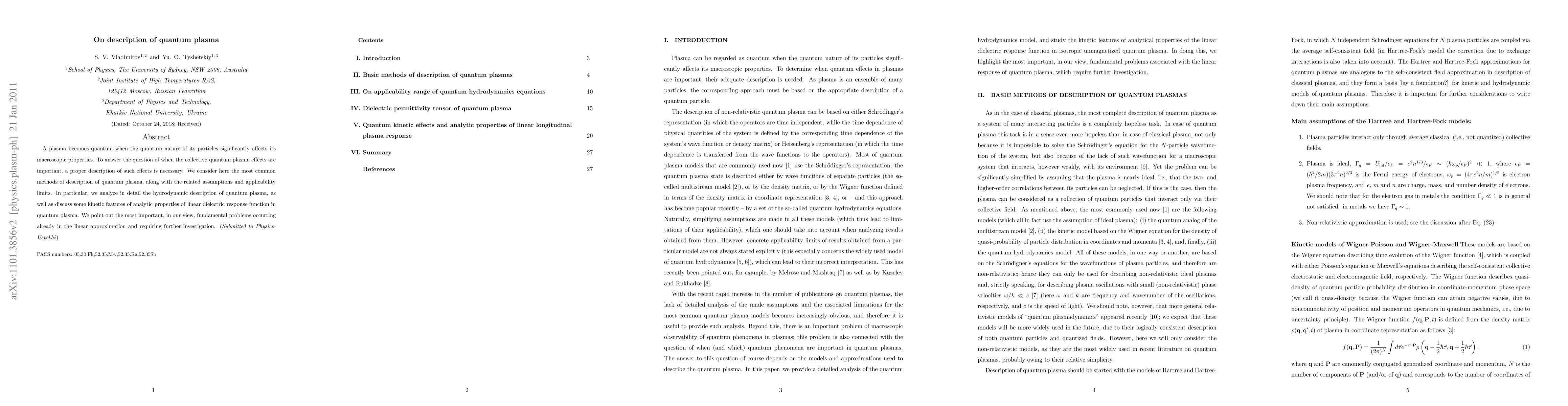 The paper provides a detailed analysis of the hydrodynamic description and kinetic features of quantum plasma, identifying and clarifying the origins of key limitations in current models.