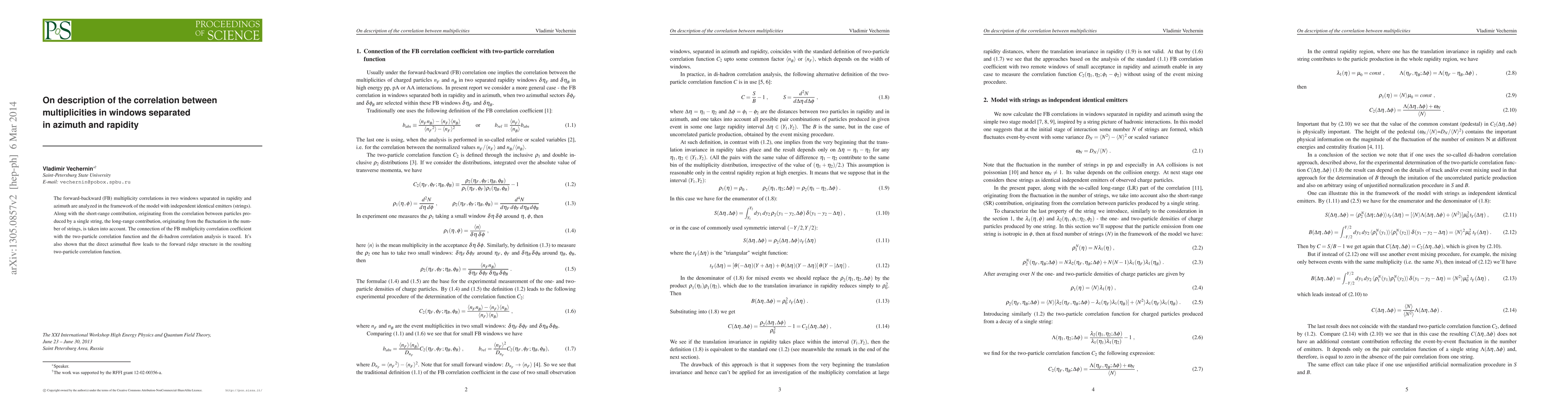 The forward-backward (FB) multiplicity correlations in two windows separated in rapidity and azimuth are analyzed in the framework of the model with independent identical emitters (strings). Along with the short-range contribution, originating from the correlation between particles produced by a single string, the long-range contribution, originating from the fluctuation in the number of strings, is taken into account. The connection of the FB multiplicity correlation coefficient with the two-particle correlation function and the di-hadron correlation analysis is traced. It's also shown that the direct azimuthal flow leads to the forward ridge structure in the resulting two-particle correlation function.