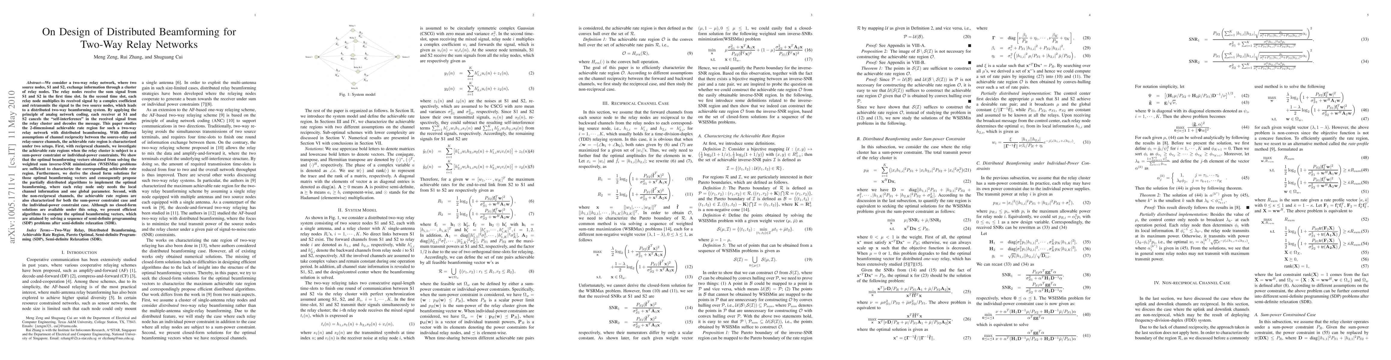 This paper explores distributed beamforming in two-way relay networks, focusing on the achievable rate region under different channel reciprocity assumptions. It characterizes optimal beamforming vectors for both reciprocal and non-reciprocal channels, proposing algorithms for implementing these solutions with local channel information and global parameters.