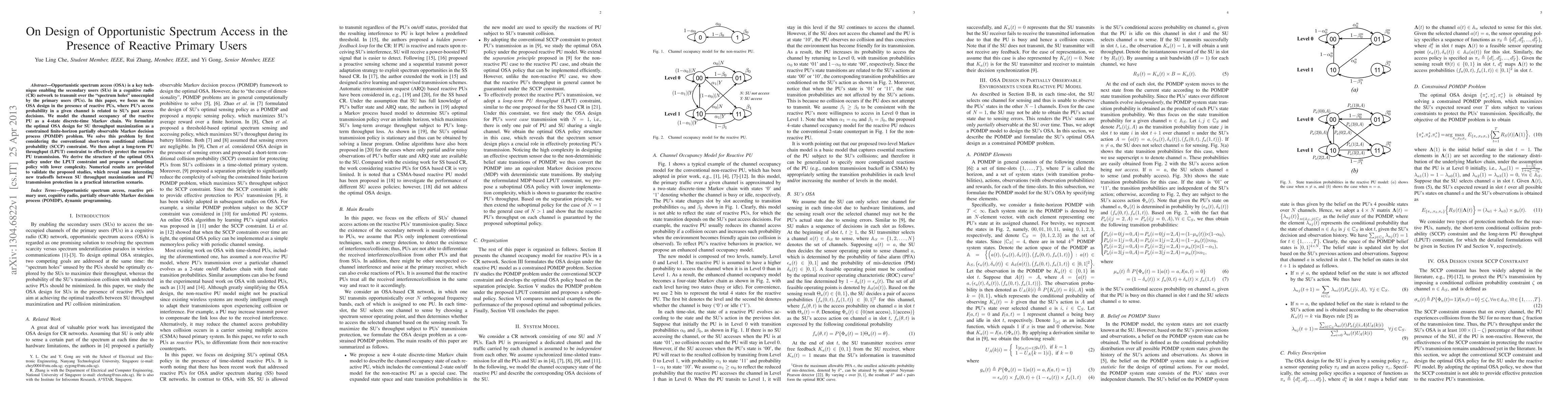 This paper designs opportunistic spectrum access (OSA) for cognitive radio networks with reactive primary users (PUs) whose access probability depends on secondary users' (SUs) past decisions. The authors formulate the problem as a constrained finite-horizon partially observable Markov decision process (POMDP) and propose a suboptimal policy to maximize SU throughput while protecting PU transmissions, validated through numerical results.