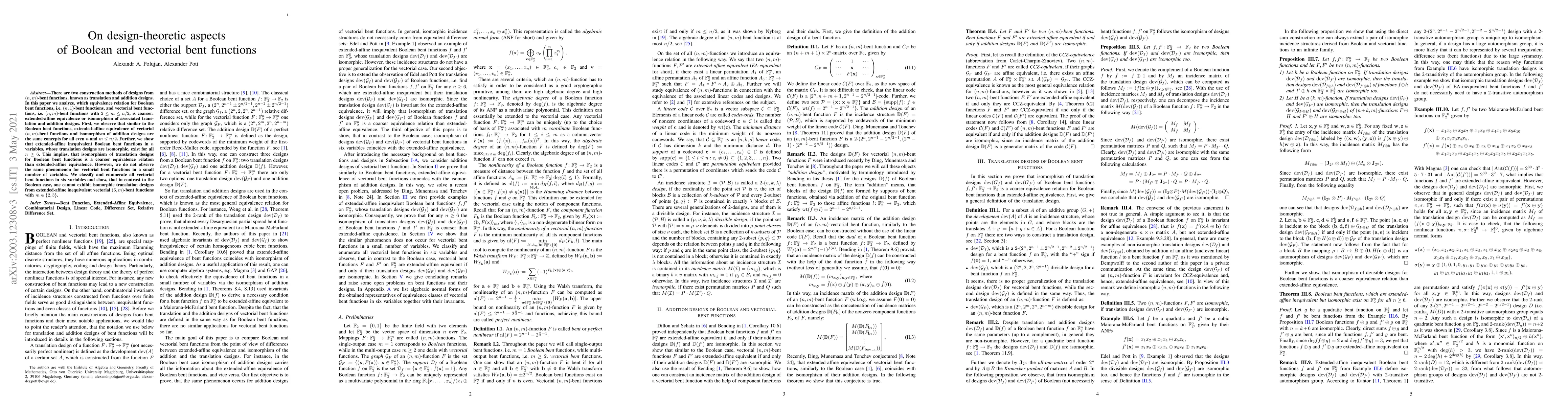 This paper investigates the equivalence relations for Boolean and vectorial bent functions in terms of design-theoretic aspects, specifically comparing extended-affine equivalence and isomorphism of associated translation and addition designs. It concludes that for Boolean bent functions, isomorphism of translation designs is a coarser equivalence relation than extended-affine equivalence, while for vectorial bent functions in six variables, no such coarser equivalence is observed.