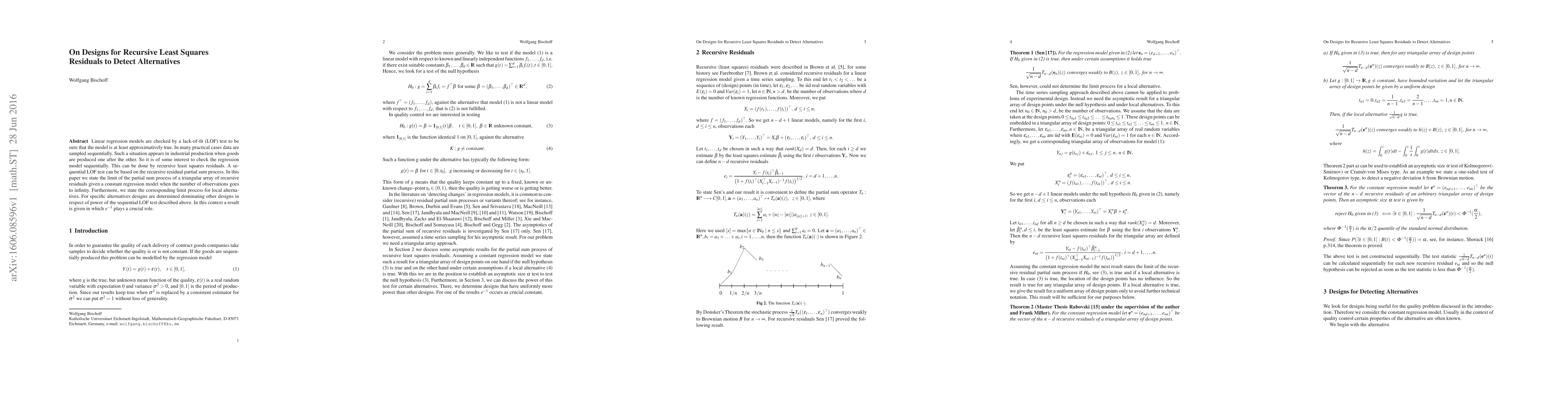Linear regression models are checked by a lack-of-fit (LOF) test to be sure that the model is at least approximatively true. In many practical cases data are sampled sequentially. Such a situation appears in industrial production when goods are produced one after the other. So it is of some interest to check the regression model sequentially. This can be done by recursive least squares residuals. A sequential LOF test can be based on the recursive residual partial sum process. In this paper we state the limit of the partial sum process of a triangular array of recursive residuals given a constant regression model when the number of observations goes to infinity. Furthermore, we state the corresponding limit process for local alternatives. For specific alternatives designs are determined dominating other designs in respect of power of the sequential LOF test described above. In this context a result is given in which $e^{-1}$ plays a crucial role.