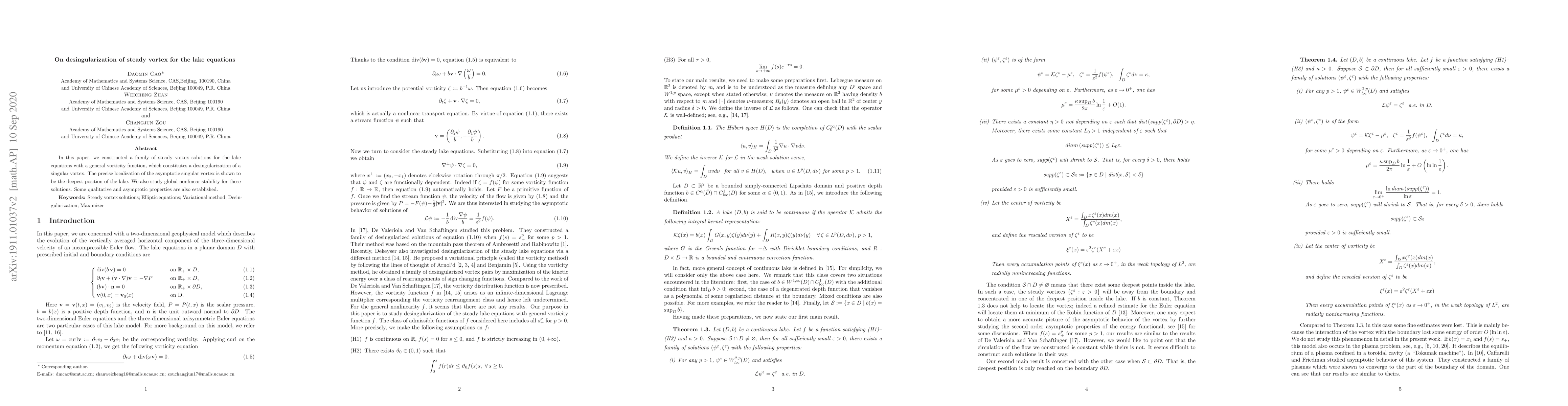 We constructed a family of steady vortex solutions for the lake equations with general vorticity function, which constitute a desingularization of a singular vortex. The precise localization of the asymptotic singular vortex is shown to be the deepest position of the lake. We also study global nonlinear stability for these solutions. Some qualitative and asymptotic properties are also established.