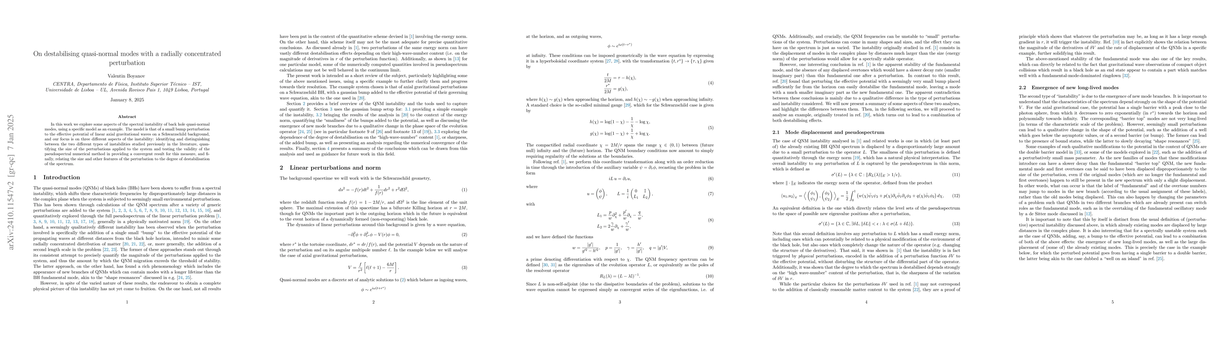 This research investigates spectral instability in black hole quasi-normal modes through a Schwarzschild background model with a radial bump perturbation. It distinguishes between types of instability, quantifies perturbation sizes, tests numerical method accuracy, and correlates perturbation characteristics with spectral destabilization.