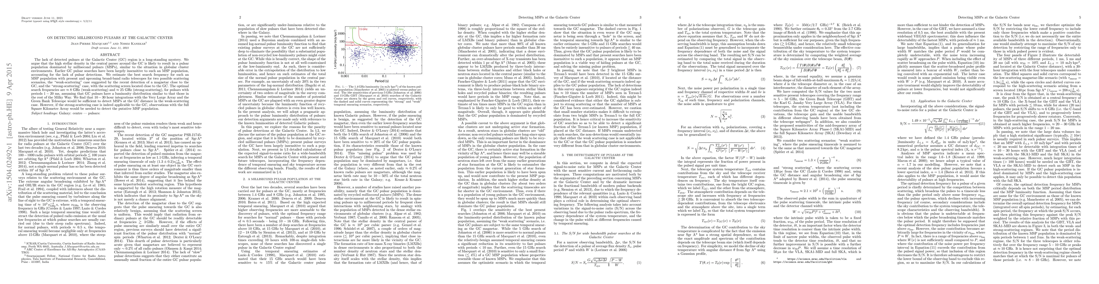 This paper argues that the Galactic Center's high stellar density likely harbors a population of undetected millisecond pulsars, similar to globular clusters. It proposes optimal search frequencies of 8 GHz for weak-scattering and 25 GHz for strong-scattering scenarios to detect these pulsars, suggesting that current telescopes may suffice for weak-scattering but the SKA is needed for strong-scattering.