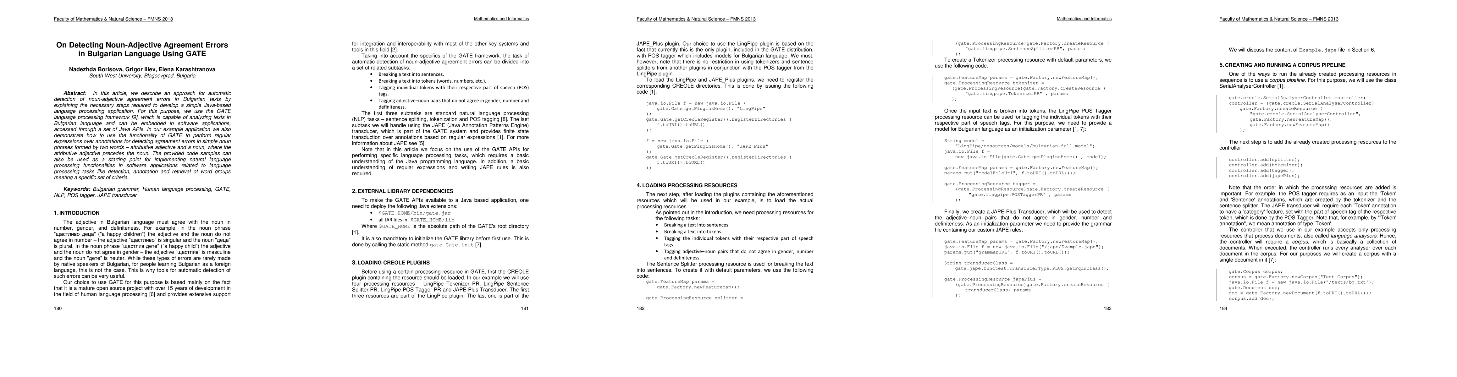 This paper outlines a method for detecting noun-adjective agreement errors in Bulgarian texts using the GATE framework, detailing the development of a Java-based language processing application. The approach employs GATE's capabilities and regular expressions to identify errors in simple noun phrases, providing code samples for broader language processing applications.