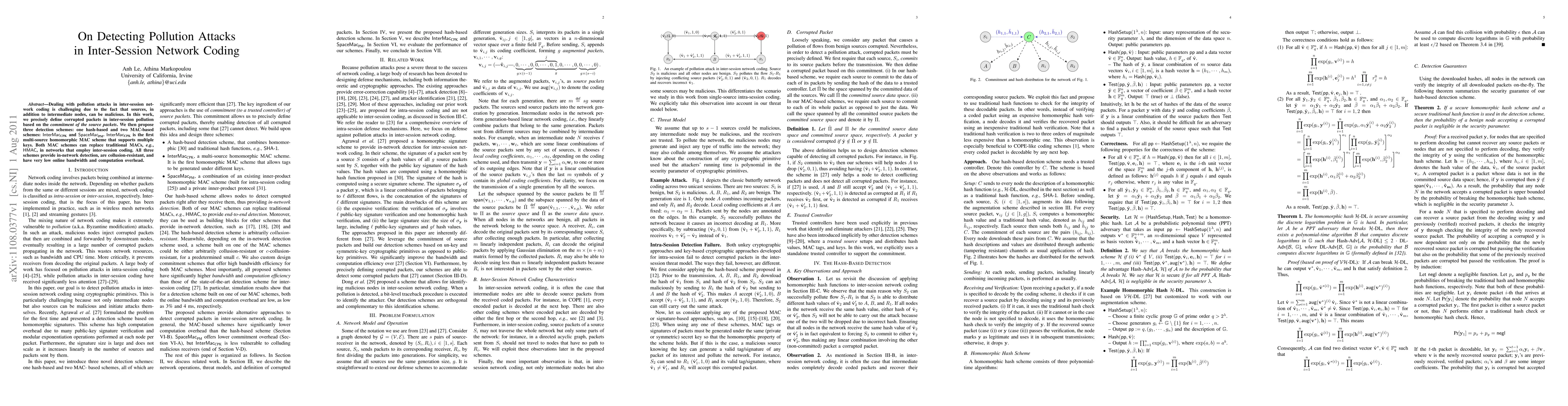 This paper defines corrupted packets in inter-session network coding and proposes three detection schemes—one hash-based and two MAC-based (InterMacCPK and SpaceMacPM). InterMacCPK is a multi-source homomorphic MAC supporting multiple keys, offering collusion-resistant, low-overhead in-network detection.