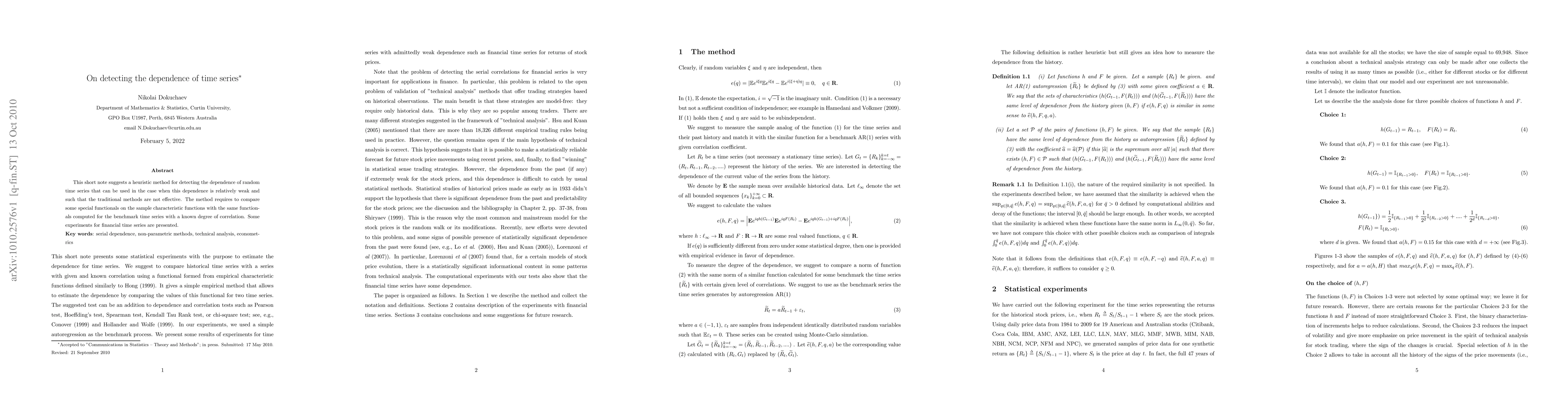 This short note suggests a heuristic method for detecting the dependence of random time series that can be used in the case when this dependence is relatively weak and such that the traditional methods are not effective. The method requires to compare some special functionals on the sample characteristic functions with the same functionals computed for the benchmark time series with a known degree of correlation. Some experiments for financial time series are presented.