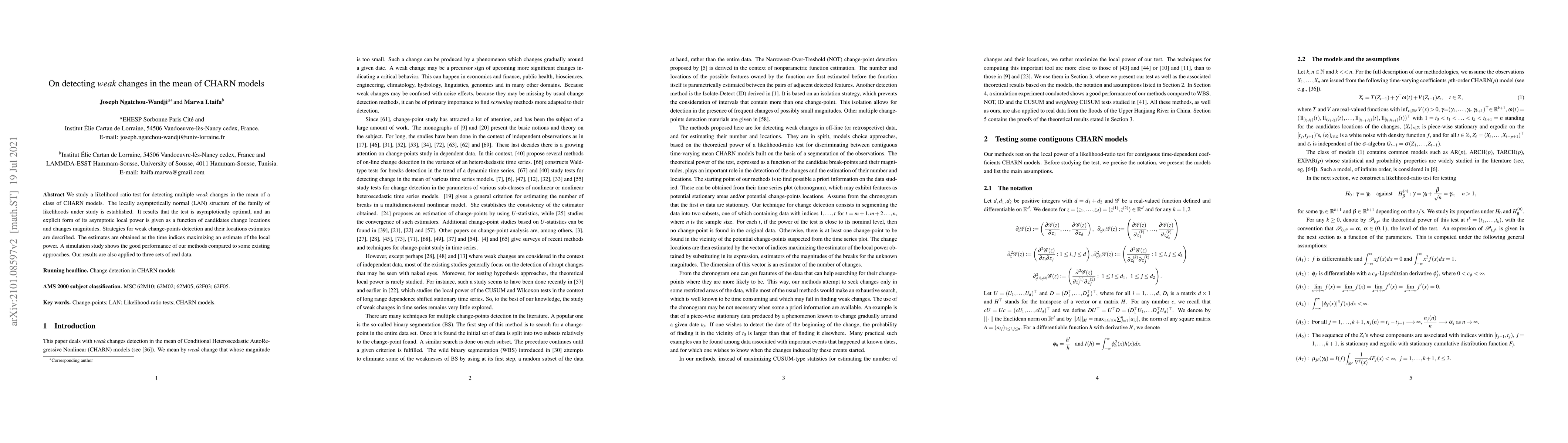 We study a likelihood ratio test for detecting multiple {\it weak} changes in the mean of a class of CHARN models. The locally asymptotically normal (LAN) structure of the family of likelihoods under study is established. It results that the test is asymptotically optimal, and an explicit form of its asymptotic local power is given as a function of candidates change locations and changes magnitudes. Strategies for weak change-points detection and their locations estimates are described. The estimates are obtained as the time indices maximizing an estimate of the local power. A simulation study shows the good performance of our methods compared to some existing approaches. Our results are also applied to three sets of real data.