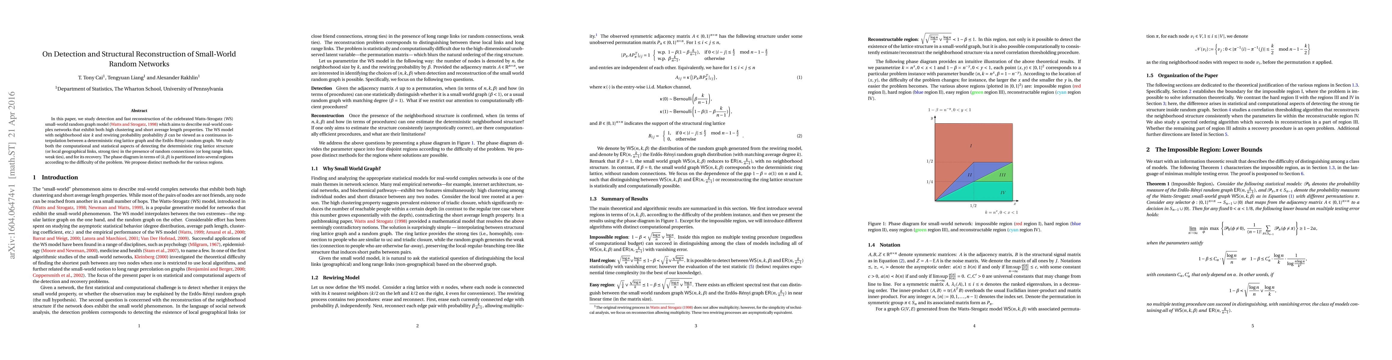 In this paper, we study detection and fast reconstruction of the celebrated Watts-Strogatz (WS) small-world random graph model \citep{watts1998collective} which aims to describe real-world complex networks that exhibit both high clustering and short average length properties. The WS model with neighborhood size $k$ and rewiring probability probability $\beta$ can be viewed as a continuous interpolation between a deterministic ring lattice graph and the Erd\H{o}s-R\'{e}nyi random graph. We study both the computational and statistical aspects of detecting the deterministic ring lattice structure (or local geographical links, strong ties) in the presence of random connections (or long range links, weak ties), and for its recovery. The phase diagram in terms of $(k,\beta)$ is partitioned into several regions according to the difficulty of the problem. We propose distinct methods for the various regions.