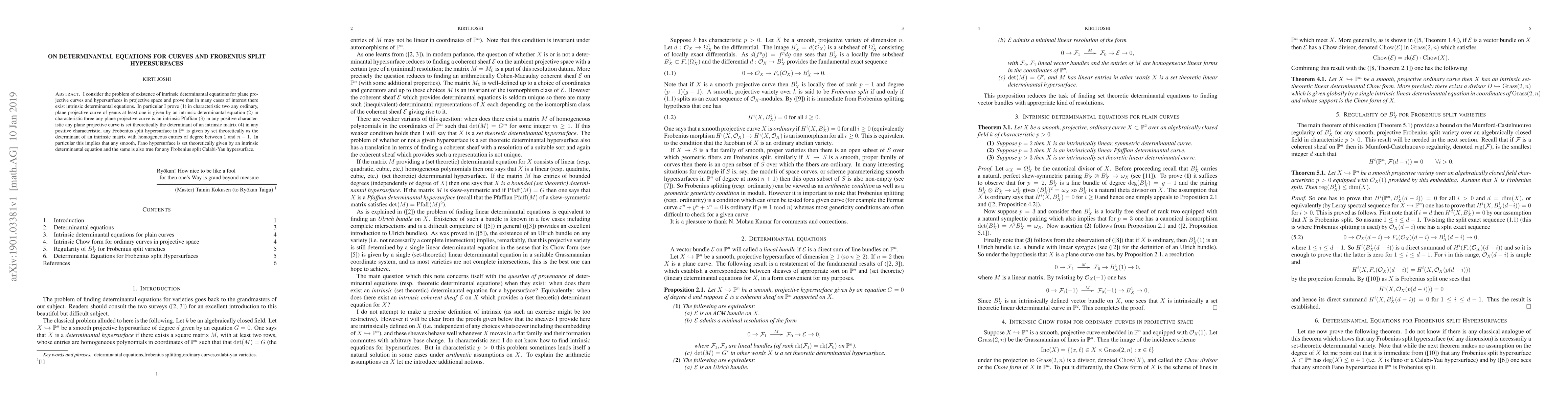 I consider the problem of existence of intrinsic determinantal equations for plane projective curves and hypersurfaces in projective space and prove that in many cases of interest there exist intrinsic determinantal equations. In particular I prove (1) in characteristic two any ordinary, plane projective curve of genus at least one is given by an intrinsic determinantal equation (2) in characteristic three any plane projective curve is an intrinsic Pfaffian (3) in any positive characteristic any plane projective curve is set theoretically the determinant of an intrinsic matrix (4) in any positive characteristic, any Frobenius split hypersurface in ${\bf P}^n$ is given by set theoretically as the determinant of an intrinsic matrix with homogeneous entries of degree between $1$ and $n-1$. In particular this implies that any smooth, Fano hypersurface is set theoretically given by an intrinsic determinantal equation and the same is also true for any Frobenius split Calabi-Yau hypersurface.