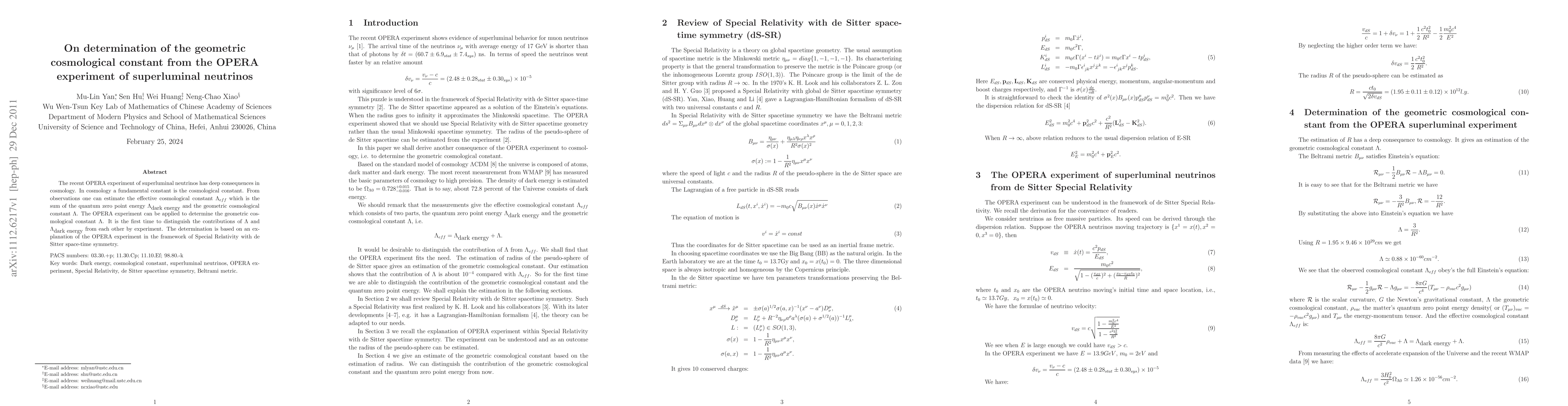 The OPERA experiment of superluminal neutrinos provides a novel method to determine the geometric cosmological constant $\Lambda$ from Special Relativity within de Sitter space-time, distinguishing it from the quantum zero point energy $\Lambda_{dark energy}$ for the first time. This approach has significant implications for our understanding of the fundamental constants in cosmology.