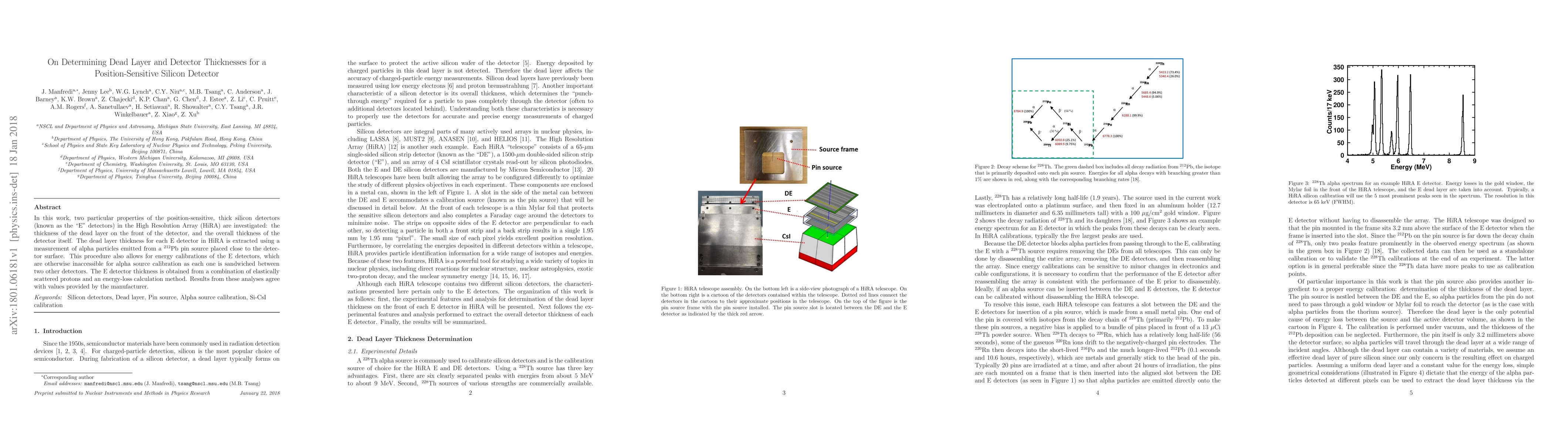 This paper investigates the dead layer thickness and overall detector thickness of position-sensitive silicon detectors in the High Resolution Array (HiRA). The dead layer is determined via alpha particle measurements from a $^{212}$Pb source, while detector thickness is derived from proton scattering and energy-loss calculations, corroborating manufacturer-provided values.