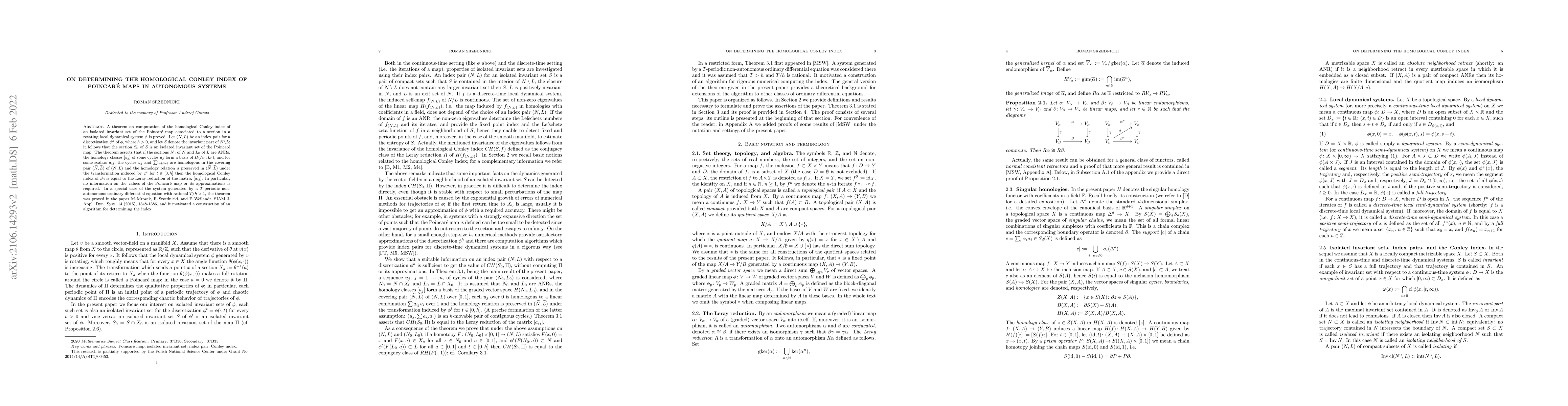 A theorem on computation of the homological Conley index of an isolated invariant set of the Poincar\'e map associated to a section in a rotating local dynamical system $\phi$ is proved. Let $(N,L)$ be an index pair for a discretization $\phi^h$ of $\phi$, where $h>0$, and let $S$ denote the invariant part of $N\setminus L$; it follows that the section $S_0$ of $S$ is an isolated invariant set of the Poincar\'e map. The theorem asserts that if the sections $N_0$ of $N$ and $L_0$ of $L$ are ANRs, the homology classes $[u_j]$ of some cycles $u_j$ form a basis of $H(N_0,L_0)$, and for some scalars $a_{ij}$, the cycles $u_j$ and $\sum a_{ij}u_i$ are homologous in the covering pair $(\widetilde N,\widetilde L)$ of $(N,L)$ and the homology relation is preserved in $(\widetilde N,\widetilde L)$ under the transformation induced by $\phi^t$ for $t\in [0,h]$ then the homological Conley index of $S_0$ is equal to the Leray reduction of the matrix $[a_{ij}]$. In particular, no information on the values of the Poincar\'e map or its approximations is required. In a special case of the system generated by a $T$-periodic non-autonomous ordinary differential equation with rational $T/h>1$, the theorem was proved in the paper M.\,Mrozek, R.\,Srzednicki, and F.\,Weilandt, SIAM J. Appl. Dyn. Syst. 14 (2015), 1348-1386, and it motivated a construction of an algorithm for determining the index.
