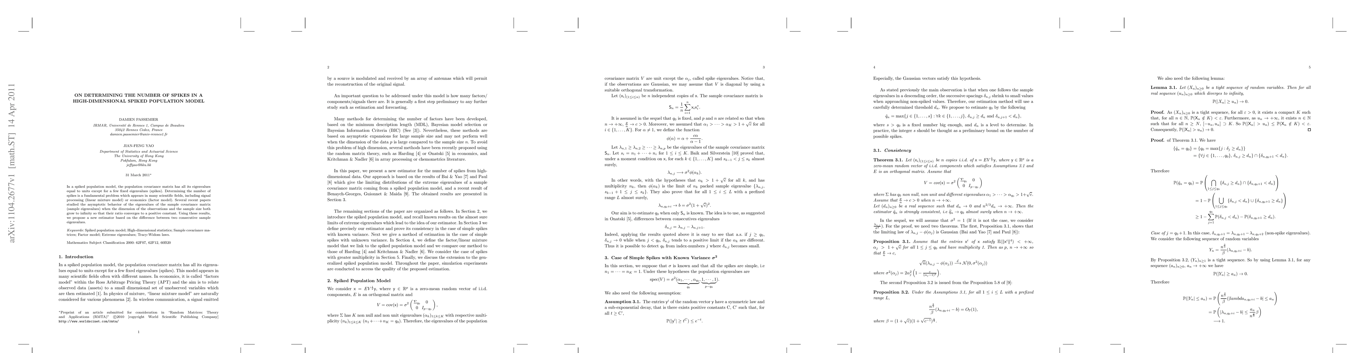 This paper proposes a new estimator to determine the number of "spikes" in a high-dimensional spiked population model, where the population covariance matrix has most eigenvalues equal to one but a few are distinct. The method leverages the difference between consecutive sample eigenvalues derived from asymptotic behavior analysis.