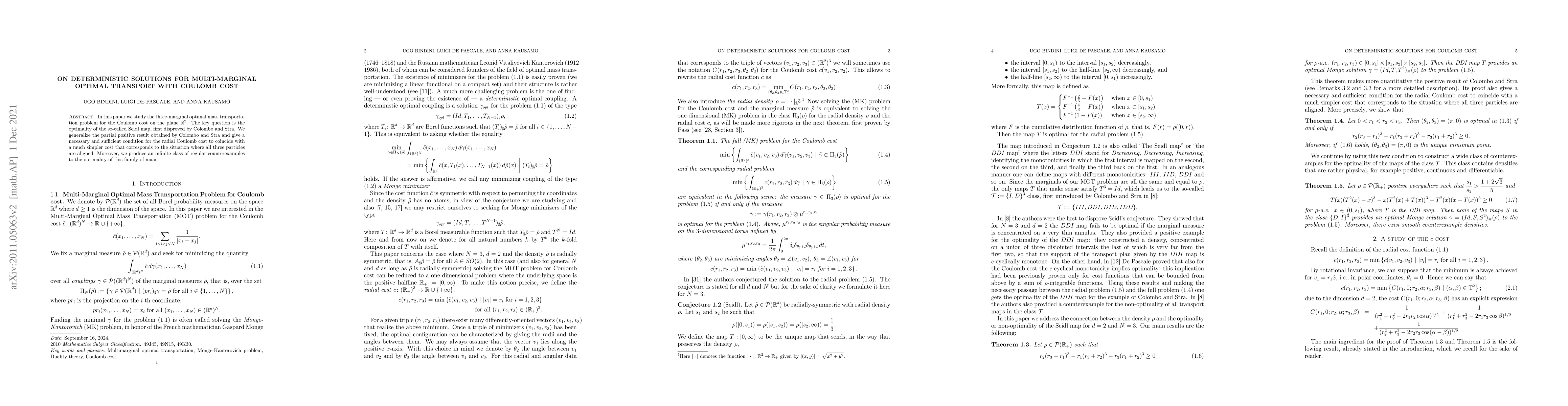 This paper investigates the three-marginal optimal transport problem with Coulomb cost in $\R^2$, proving a necessary and sufficient condition for the radial Coulomb cost to align with a simpler cost. It also disproves the optimality of the Seidl map and presents an infinite class of counterexamples.