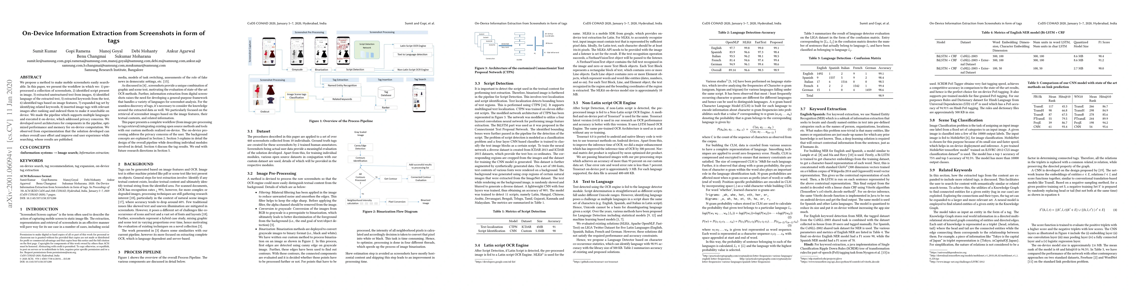 This paper proposes a method for making mobile screenshots searchable by extracting unstructured text, identifying keywords, and generating tags based on image features. The on-device pipeline supports multiple languages and optimizes performance, significantly reducing user effort and enhancing search experience.