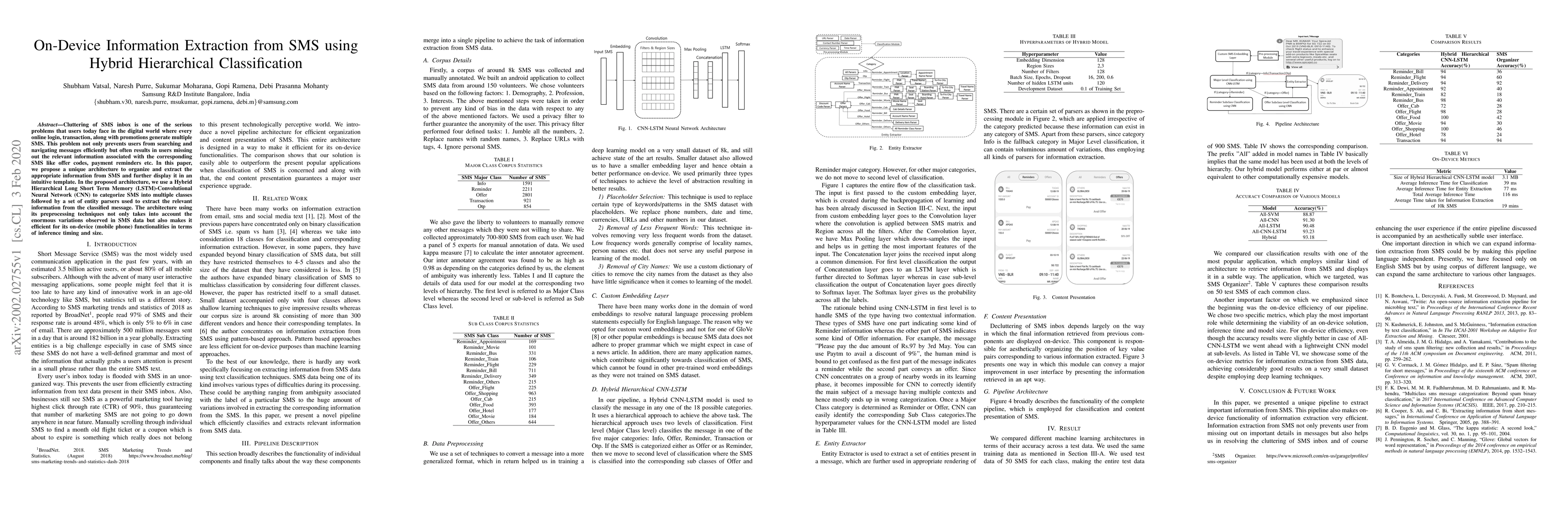 Cluttering of SMS inbox is one of the serious problems that users today face in the digital world where every online login, transaction, along with promotions generate multiple SMS. This problem not only prevents users from searching and navigating messages efficiently but often results in users missing out the relevant information associated with the corresponding SMS like offer codes, payment reminders etc. In this paper, we propose a unique architecture to organize and extract the appropriate information from SMS and further display it in an intuitive template. In the proposed architecture, we use a Hybrid Hierarchical Long Short Term Memory (LSTM)-Convolutional Neural Network (CNN) to categorize SMS into multiple classes followed by a set of entity parsers used to extract the relevant information from the classified message. The architecture using its preprocessing techniques not only takes into account the enormous variations observed in SMS data but also makes it efficient for its on-device (mobile phone) functionalities in terms of inference timing and size.
