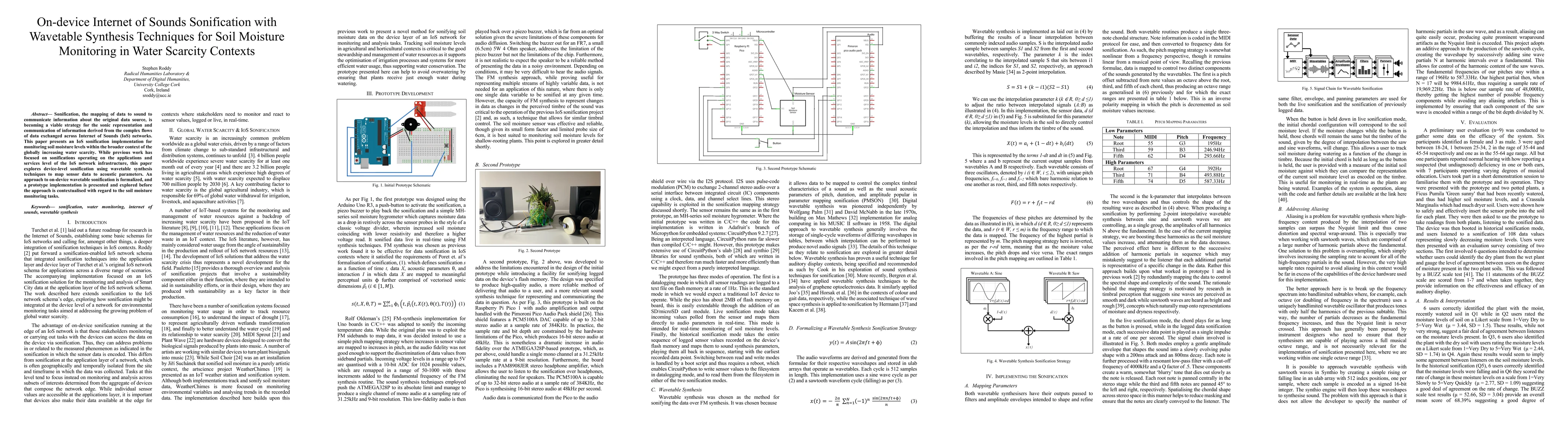The paper formalizes a wavetable synthesis sonification strategy that maps soil moisture data to both pitch (inverted mapping) and timbre (interpolation between sine and sawtooth waves), with specific harmonic and frequency parameters defined for different moisture levels.