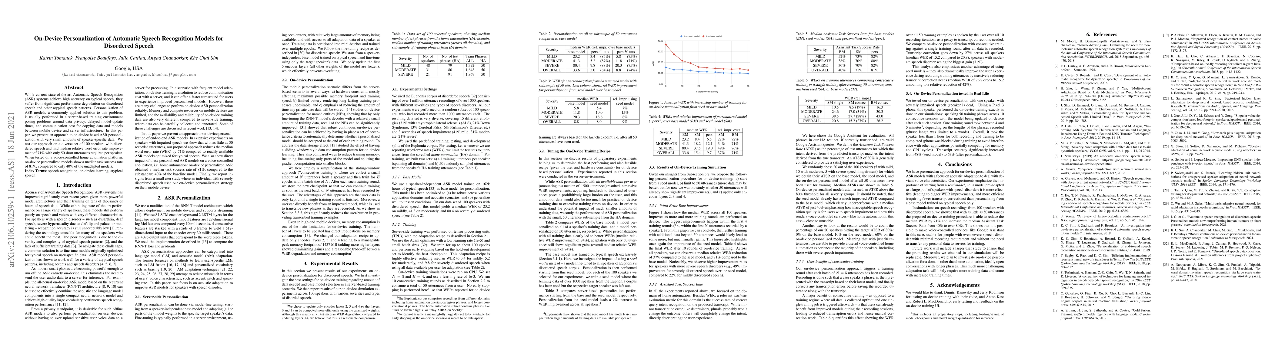 This paper proposes an on-device method for personalizing Automatic Speech Recognition (ASR) models to handle disordered speech, achieving a 71% median relative word error rate improvement with minimal data. On-device personalization enhances performance on a voice-controlled home automation platform, raising task success rates to 81% compared to 40% for unadapted models.