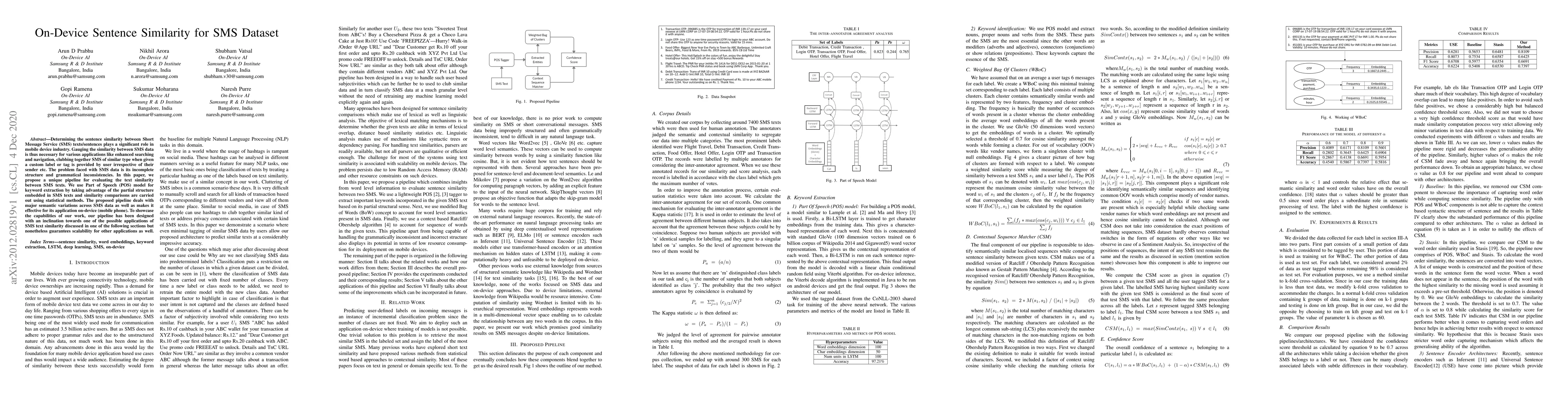 Determining the sentence similarity between Short Message Service (SMS) texts/sentences plays a significant role in mobile device industry. Gauging the similarity between SMS data is thus necessary for various applications like enhanced searching and navigation, clubbing together SMS of similar type when given a custom label or tag is provided by user irrespective of their sender etc. The problem faced with SMS data is its incomplete structure and grammatical inconsistencies. In this paper, we propose a unique pipeline for evaluating the text similarity between SMS texts. We use Part of Speech (POS) model for keyword extraction by taking advantage of the partial structure embedded in SMS texts and similarity comparisons are carried out using statistical methods. The proposed pipeline deals with major semantic variations across SMS data as well as makes it effective for its application on-device (mobile phone). To showcase the capabilities of our work, our pipeline has been designed with an inclination towards one of the possible applications of SMS text similarity discussed in one of the following sections but nonetheless guarantees scalability for other applications as well.
