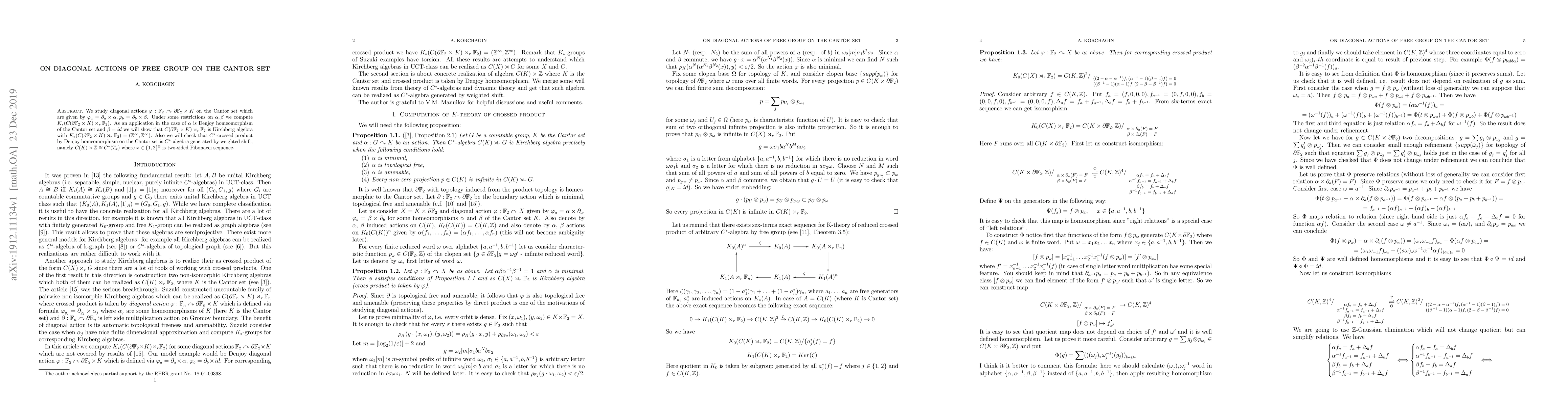 We study diagonal actions $\varphi:\mathbb{F}_2\curvearrowright\partial\mathbb{F}_2\times K$ on the Cantor set which are given by $\varphi_a=\partial_a\times\alpha,\varphi_b=\partial_b\times\beta$. Under some restrictions on $\alpha,\beta$ we compute $K_*(C(\partial\mathbb{F}_2\times K)\rtimes_r\mathbb{F}_2)$. As an application in the case of $\alpha$ is Denjoy homeomorphism of the Cantor set and $\beta=id$ we will show that $C(\partial\mathbb{F}_2\times K)\rtimes_r\mathbb{F}_2$ is Kirchberg algebra with $K_*(C(\partial\mathbb{F}_2\times K)\rtimes_r\mathbb{F}_2)=(\mathbb{Z}^\infty,\mathbb{Z}^\infty)$. Also we will check that $C^*$-crossed product by Denjoy homeomorphism on the Cantor set is $C^*$-algebra generated by weighted shift, namely $C(K)\rtimes\mathbb{Z}\cong C^*(T_x)$ where $x\in \{1,2\}^\mathbb{Z}$ is two-sided Fibonacci sequence.