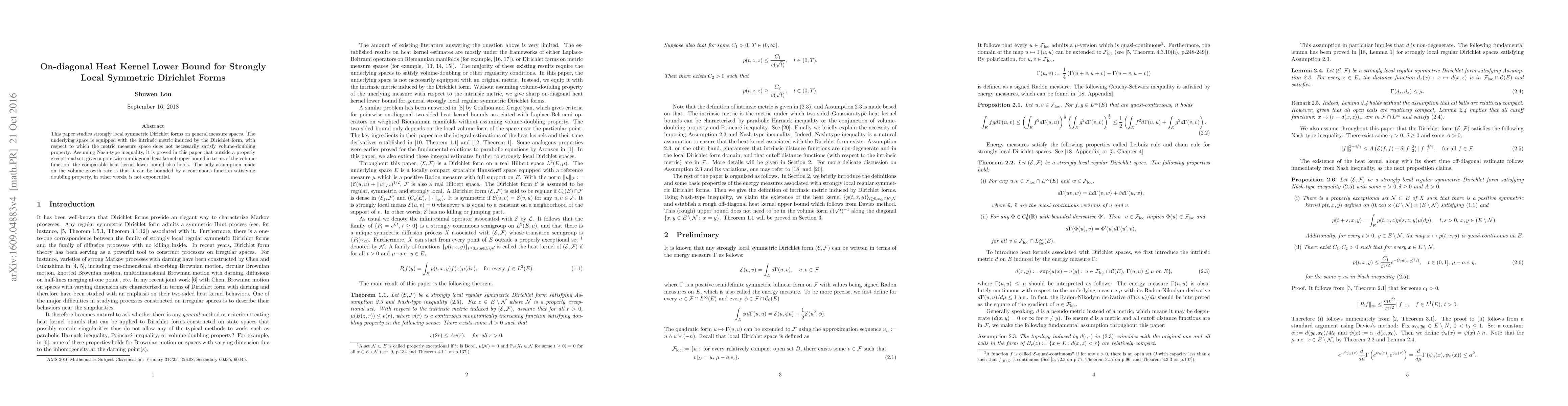 This paper studies strongly local symmetric Dirichlet forms on general measure spaces. The underlying space is equipped with the intrinsic metric induced by the Dirichlet form, with respect to which the metric measure space does not necessarily satisfy volume-doubling property. Assuming Nash-type inequality, it is proved in this paper that outside a properly exceptional set, given a pointwise on-diagonal heat kernel upper bound in terms of the volume function, the comparable heat kernel lower bound also holds. The only assumption made on the volume growth rate is that it can be bounded by a continuous function satisfying doubling property, in other words, is not exponential.