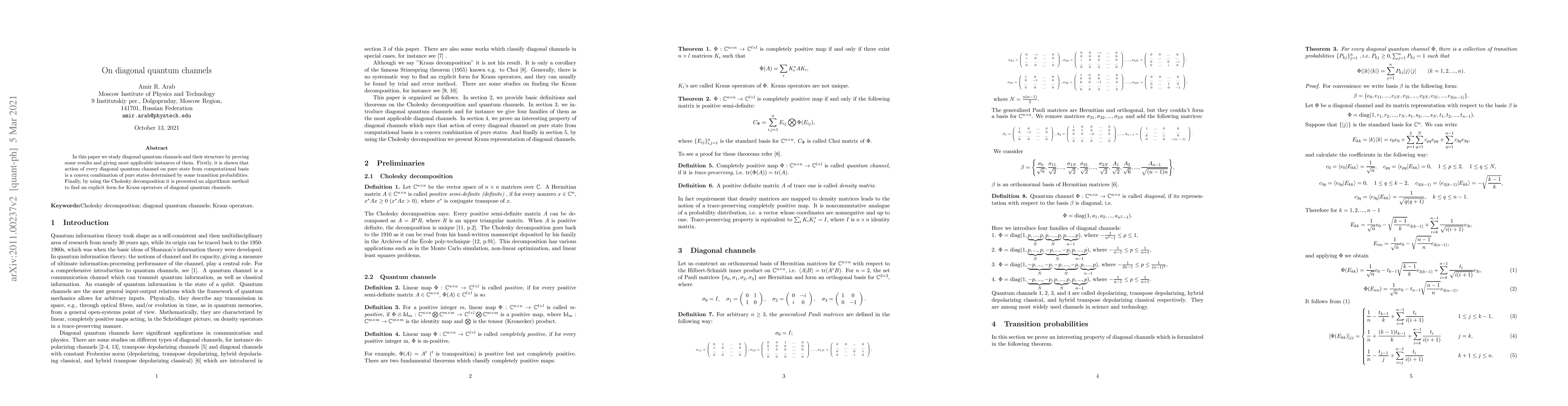 Researchers studied diagonal quantum channels, showing that applying a channel to a pure state results in a convex combination of pure states with specific transition probabilities. They also developed an algorithmic method using Cholesky decomposition to find explicit Kraus operators for these channels.