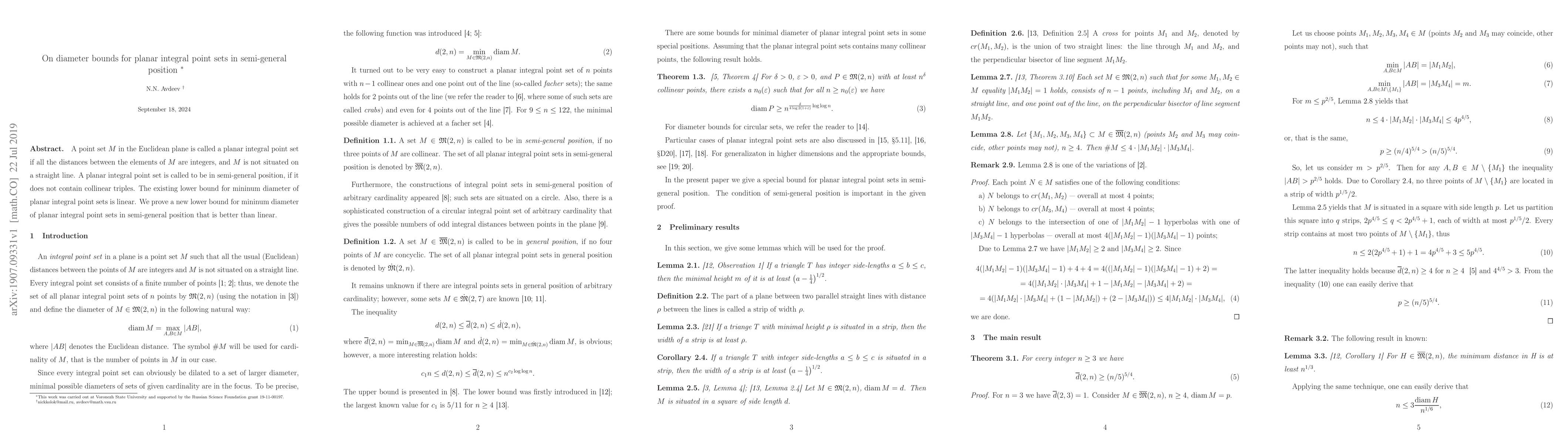 This paper establishes a new, improved lower bound for the minimum diameter of planar integral point sets in semi-general position, surpassing the previously linear bound. The study focuses on configurations where all pairwise distances are integers and no three points are collinear.