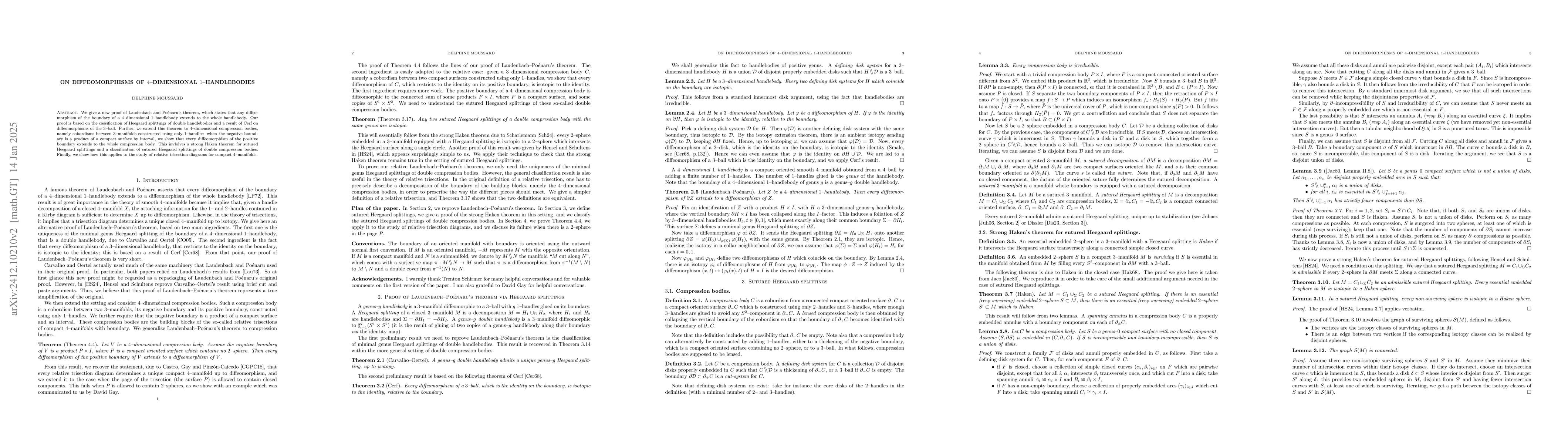 We give a new proof of Laudenbach and Po\'enaru's theorem, which states that any diffeomorphism of the boundary of a 4-dimensional 1-handlebody extends to the whole handlebody. Our proof is based on the cassification of Heegaard splittings of double handlebodies and a result of Cerf on diffeomorphisms of the 3-ball. Further, we extend this theorem to 4-dimensional compression bodies, namely cobordisms between 3-manifolds constructed using only 1-handles: when the negative boundary is a product of a compact surface by interval, we show that every diffeomorphism of the positive boundary extends to the whole compression body. This invlolves a strong Haken theorem for sutured Heegaard splittings and a classification of sutured Heegaard splittings of double compression bodies. Finally, we show how this applies to the study of relative trisection diagrams for compact 4-manifolds.