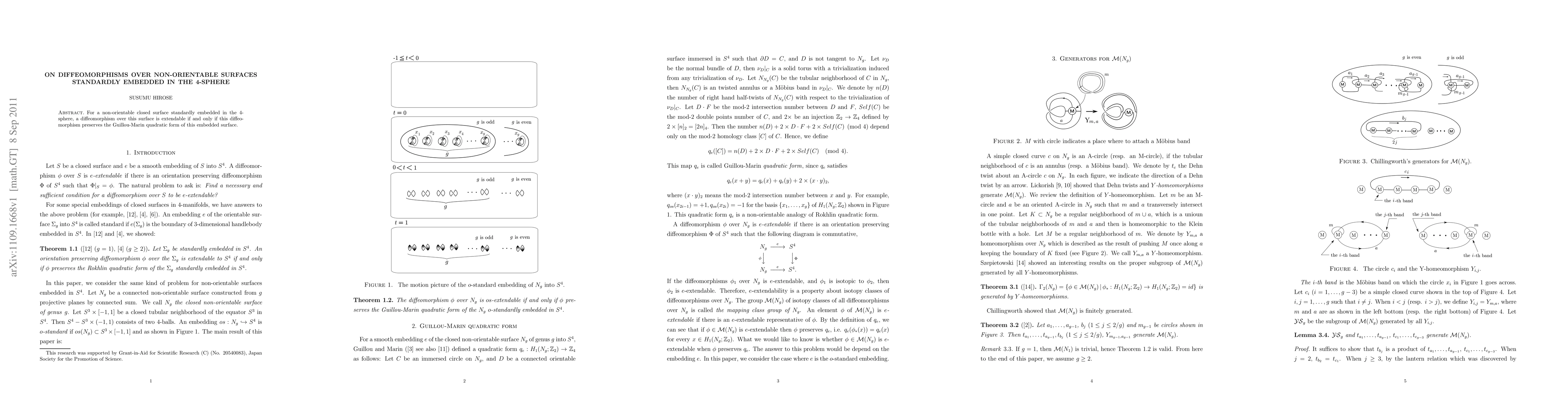 For a non-orientable closed surface standardly embedded in the 4-sphere, a diffeomorphism over this surface is extendable if and only if this diffeomorphism preserves the Guillou-Marin quadratic form of this embedded surface.
