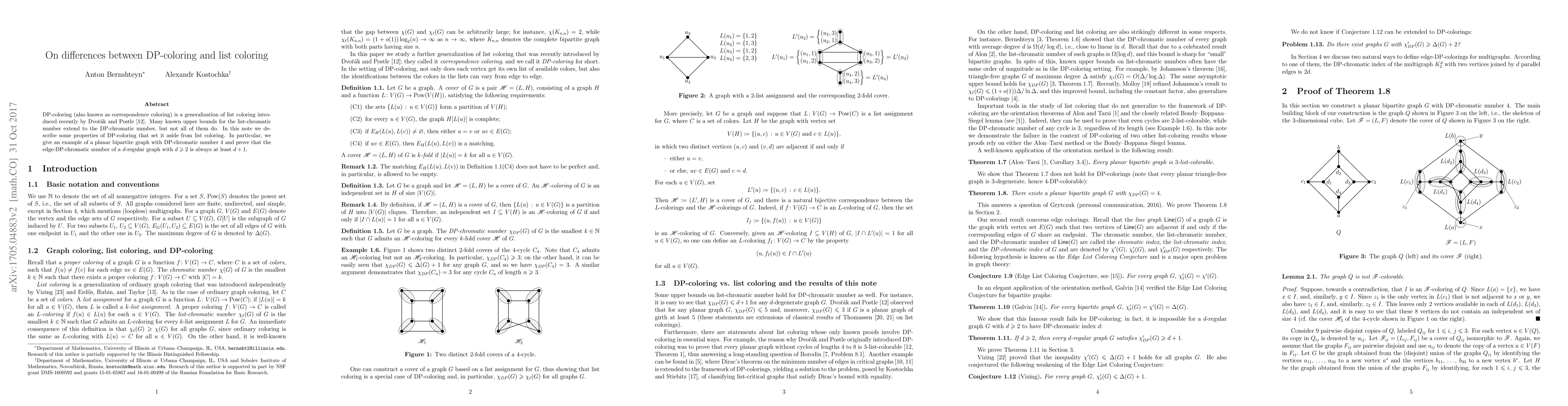 This paper explores the differences between DP-coloring and list coloring, highlighting that while many bounds for list coloring extend to DP-coloring, not all do. It presents a planar bipartite graph with a DP-chromatic number of 4 and proves that the edge-DP-chromatic number of any $d$-regular graph with $d \geq 2$ is at least $d+1$.