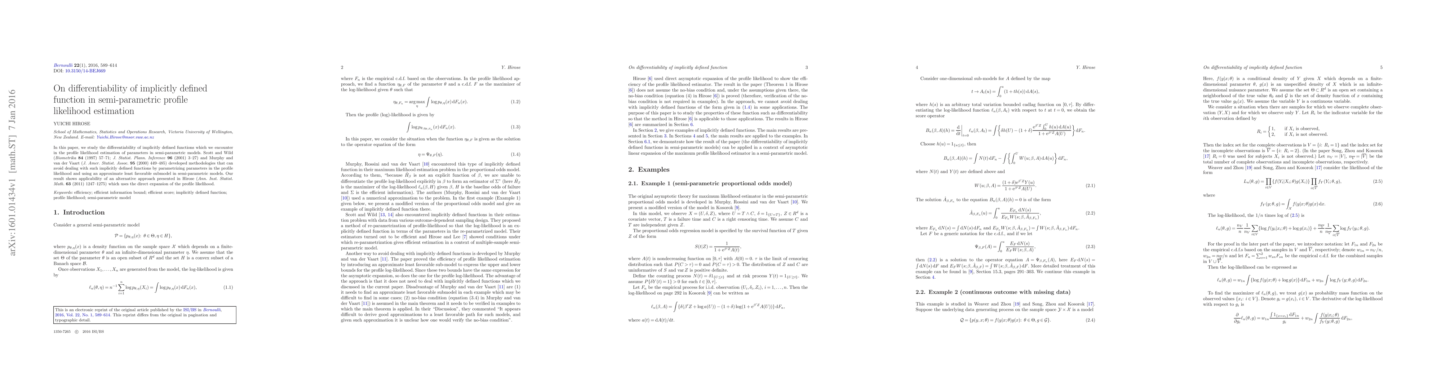 This paper investigates the differentiability of implicitly defined functions in semi-parametric profile likelihood estimation, contrasting methodologies that avoid these functions with an alternative approach using direct expansion of the profile likelihood. The findings show that Hirose’s method is applicable in this context.