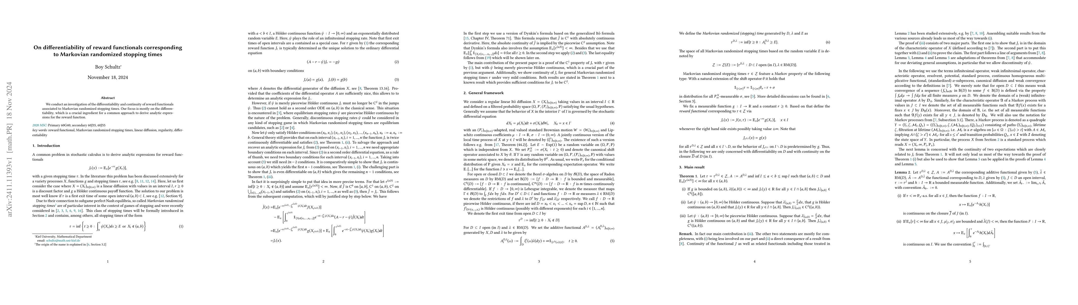 Summary: This paper explores the differentiability and continuity of reward functionals linked to Markovian randomized stopping times, emphasizing the importance of differentiability for deriving analytical expressions for these reward functions.