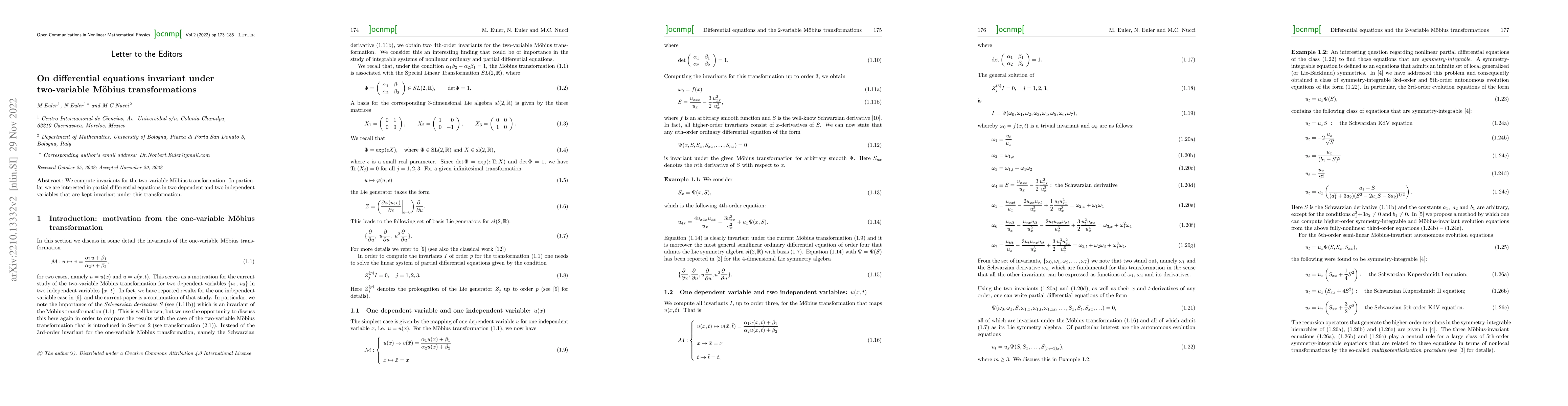 Summary: This paper investigates the invariants of two-variable Möbius transformations and identifies partial differential equations in two dependent and two independent variables that remain unchanged under these transformations. The focus is on the mathematical properties and implications of such invariance.