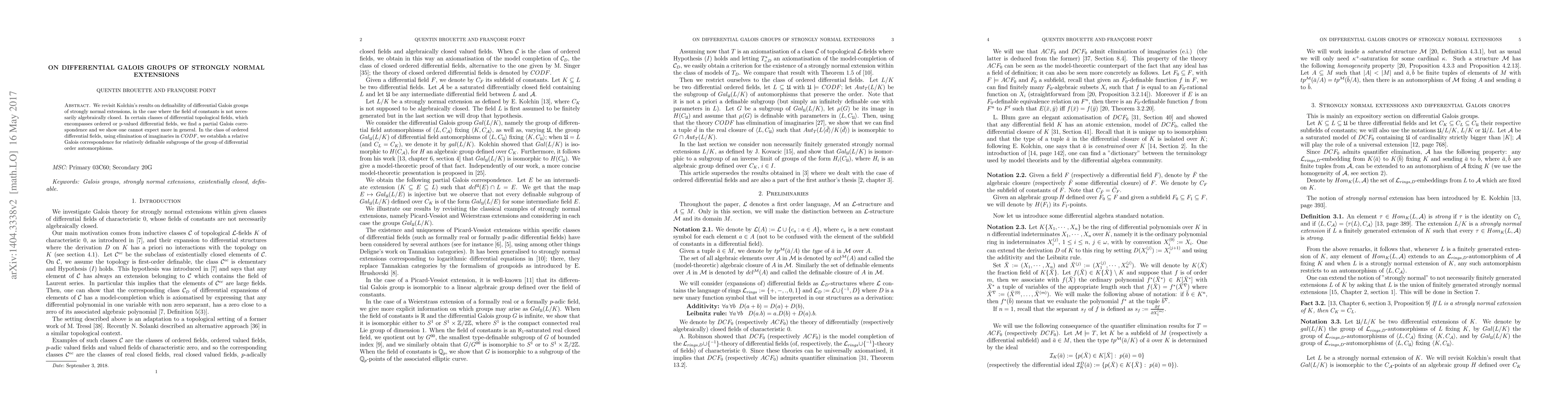 Summary: This paper explores Kolchin's theory on the definability of differential Galois groups in strongly normal extensions, particularly when the field of constants is not algebraically closed. It establishes a partial Galois correspondence in certain differential topological fields and demonstrates the limitations of extending this correspondence more broadly.