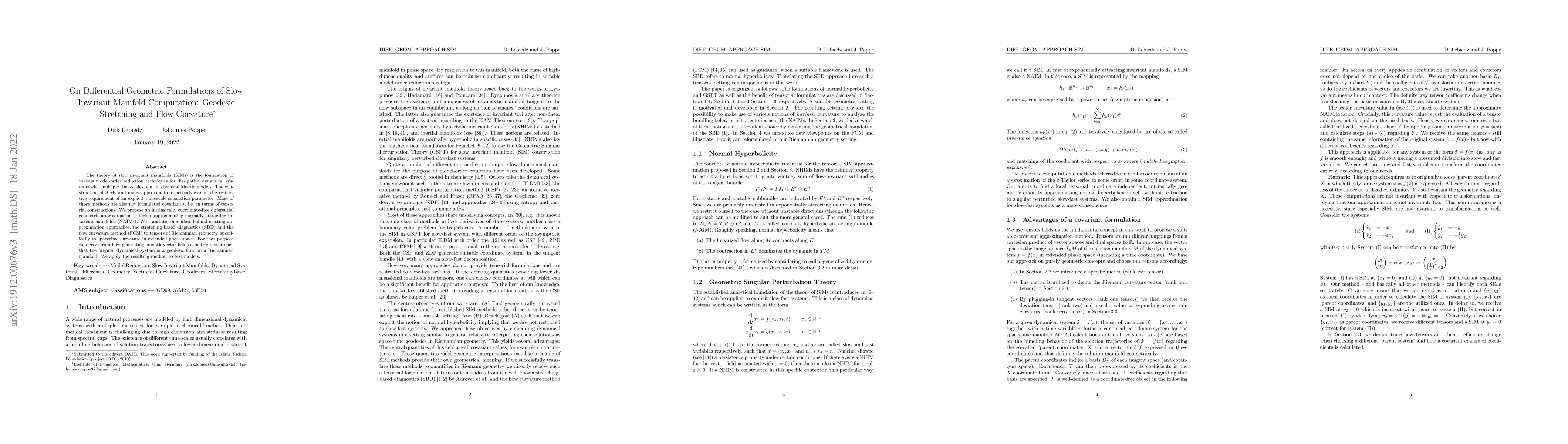 This paper proposes a differential geometric approach to construct slow invariant manifolds in dissipative dynamical systems, reformulating existing approximation methods in terms of Riemannian geometry to enhance model-order reduction techniques. The method uses spacetime curvature in extended phase space to approximate normally attracting invariant manifolds.