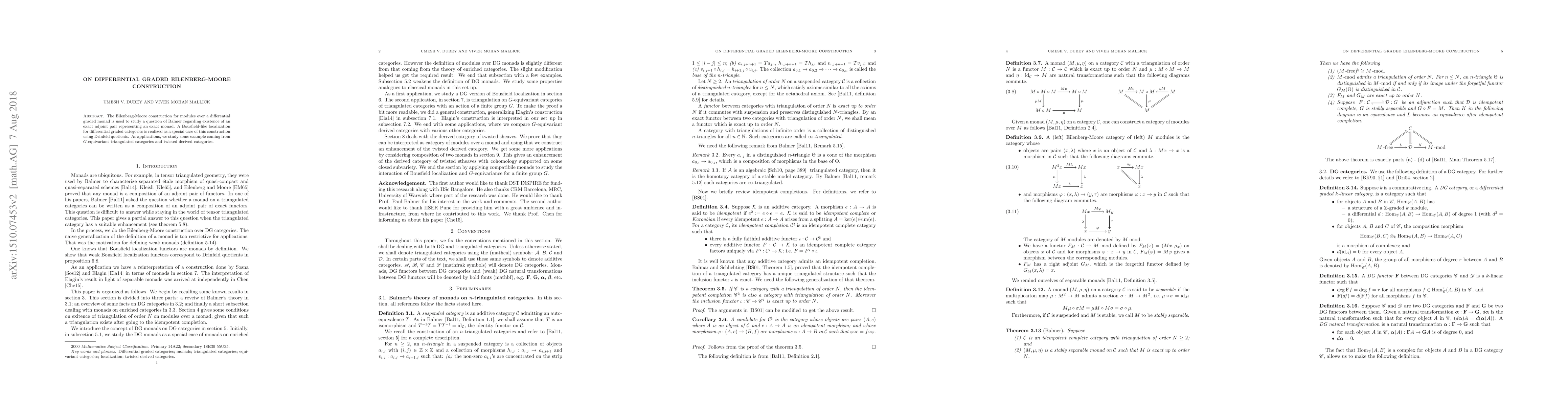This paper investigates the Eilenberg Moore construction within the context of differential graded (DG) categories, demonstrating its application in factoring monads and reinterpreting equivariant triangulated categories through adjoint exact functor compositions.