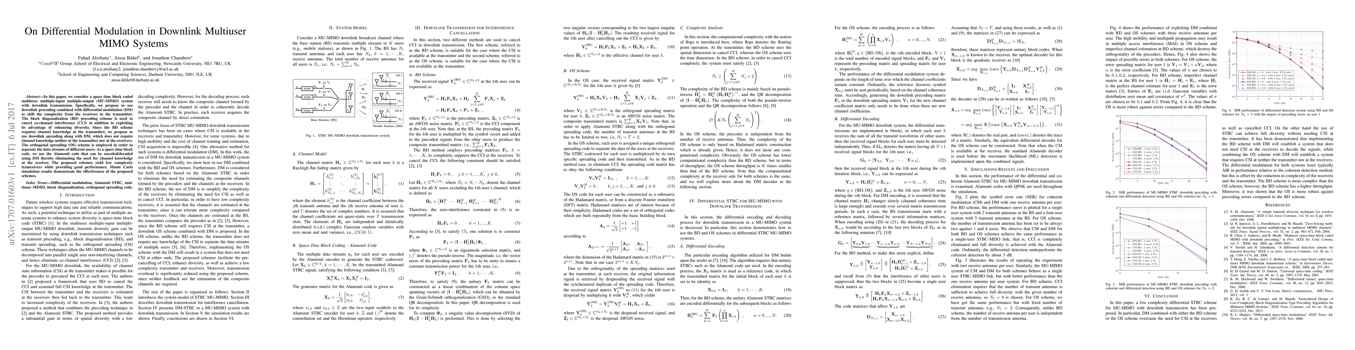 In this paper, we consider a space time block coded multiuser multiple-input multiple-output (MU-MIMO) system with downlink transmission. Specifically, we propose to use downlink precoding combined with differential modulation (DM) to shift the complexity from the receivers to the transmitter. The block diagonalization (BD) precoding scheme is used to cancel co-channel interference (CCI) in addition to exploiting its advantage of enhancing diversity. Since the BD scheme requires channel knowledge at the transmitter, we propose to use downlink spreading along with DM, which does not require channel knowledge neither at the transmitter nor at the receivers. The orthogonal spreading (OS) scheme is employed in order to separate the data streams of different users. As a space time block code, we use the Alamouti code that can be encoded/decoded using DM thereby eliminating the need for channel knowledge at the receiver. The proposed schemes yield low complexity transceivers while providing good performance. Monte Carlo simulation results demonstrate the effectiveness of the proposed schemes.