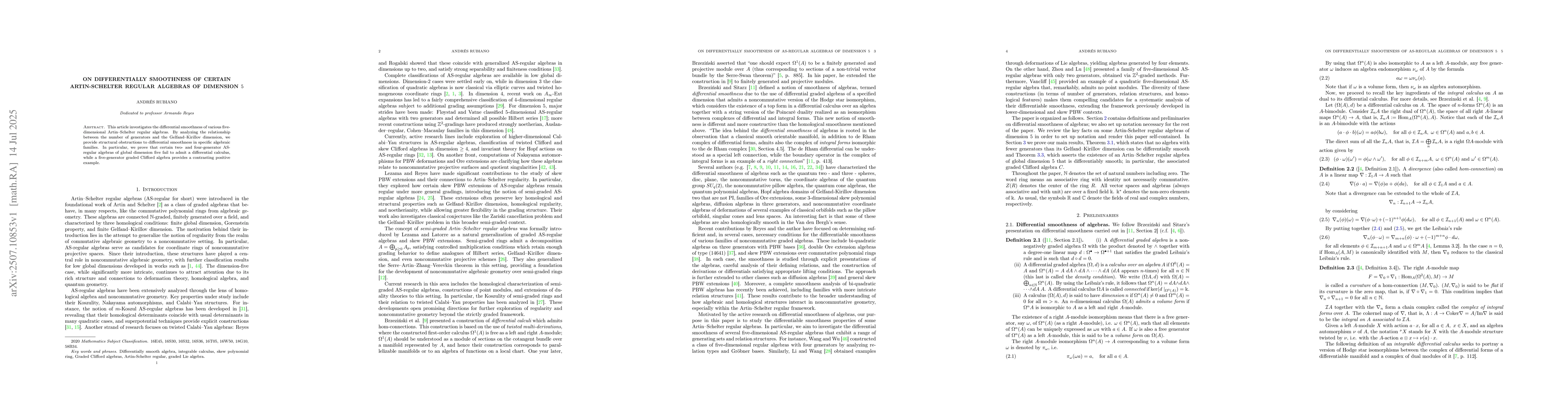This article investigates the differential smoothness of various five-dimensional Artin-Schelter regular algebras. By analyzing the relationship between the number of generators and the Gelfand-Kirillov dimension, we provide structural obstructions to differential smoothness in specific algebraic families. In particular, we prove that certain two- and four-generator AS-regular algebras of global dimension five fail to admit a differential calculus, while a five-generator graded Clifford algebra provides a contrasting positive example.